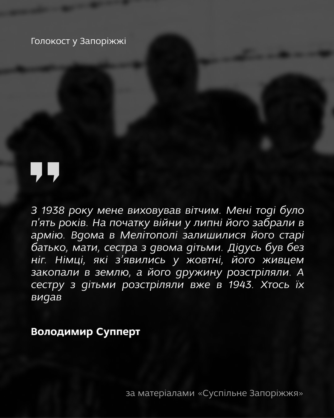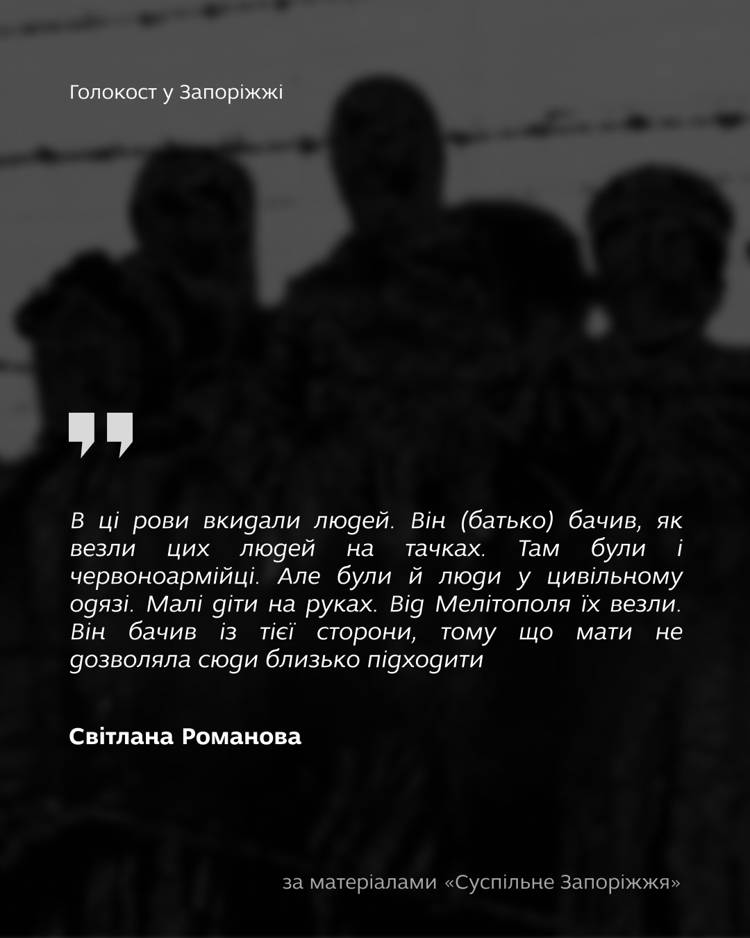 У 1942–1943 роках нацистська політика забрала життя 6 мільйонів євреїв. На території Запорізького регіону було закатовано близько 36 тисяч мирних мешканців, понад 20 тисяч із них - євреї.