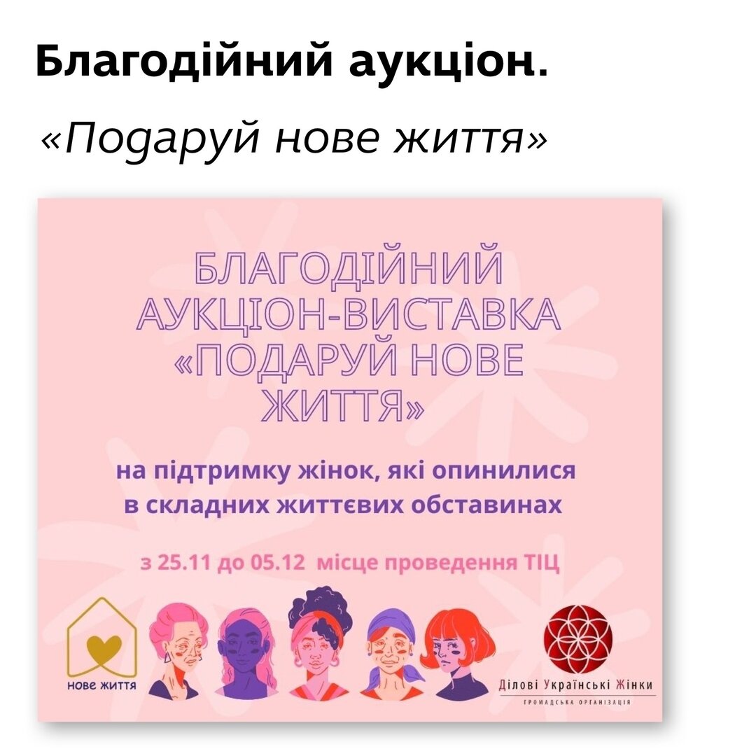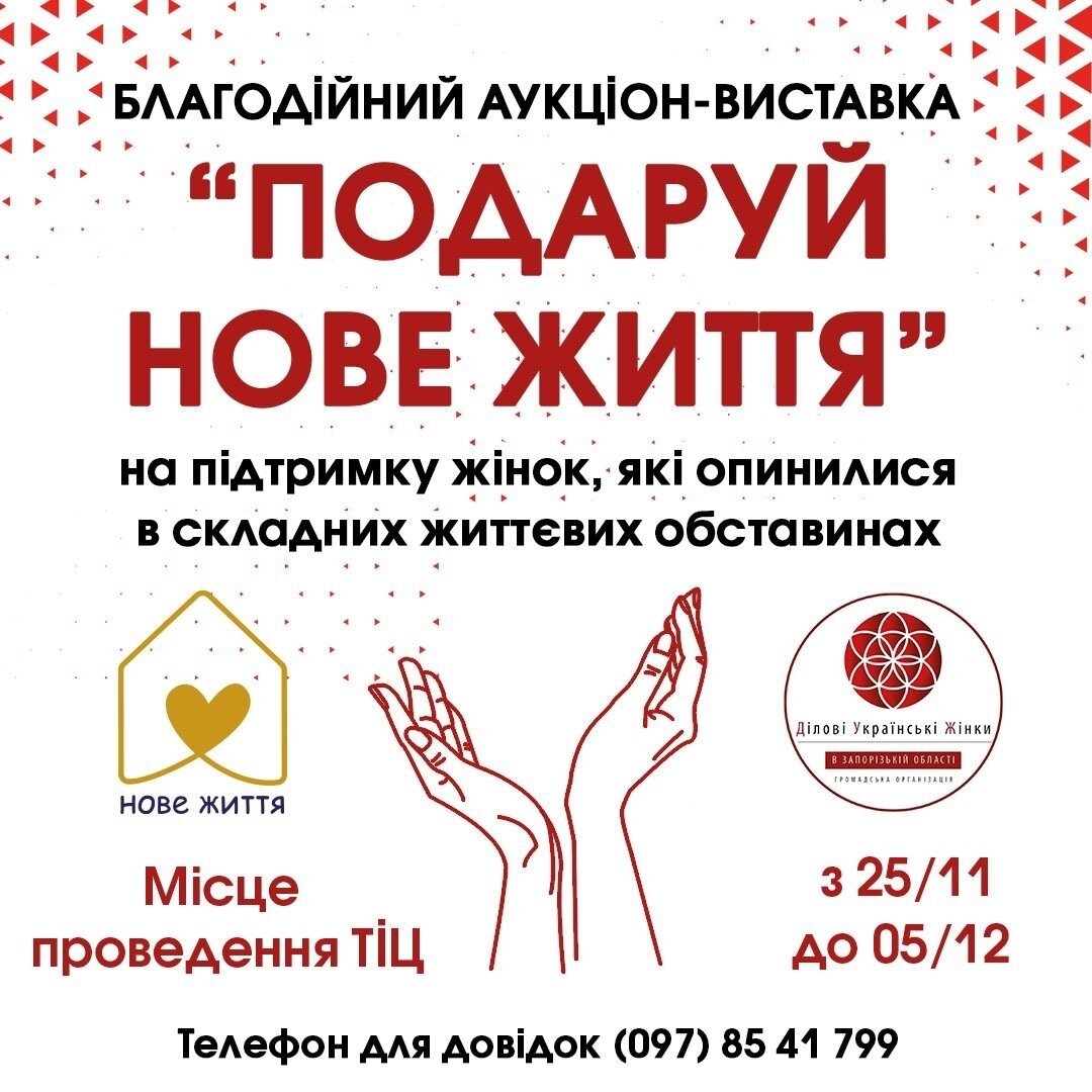 Auction-exhibition "Give New Life" - a charity event organized by the NGO "Ukrainian Business Women in Zaporozhye region" and social entrepreneurship "New Life". The purpose of the charity initiative is to help women who have suffered from domestic or gender-based violence or are at risk of violence.