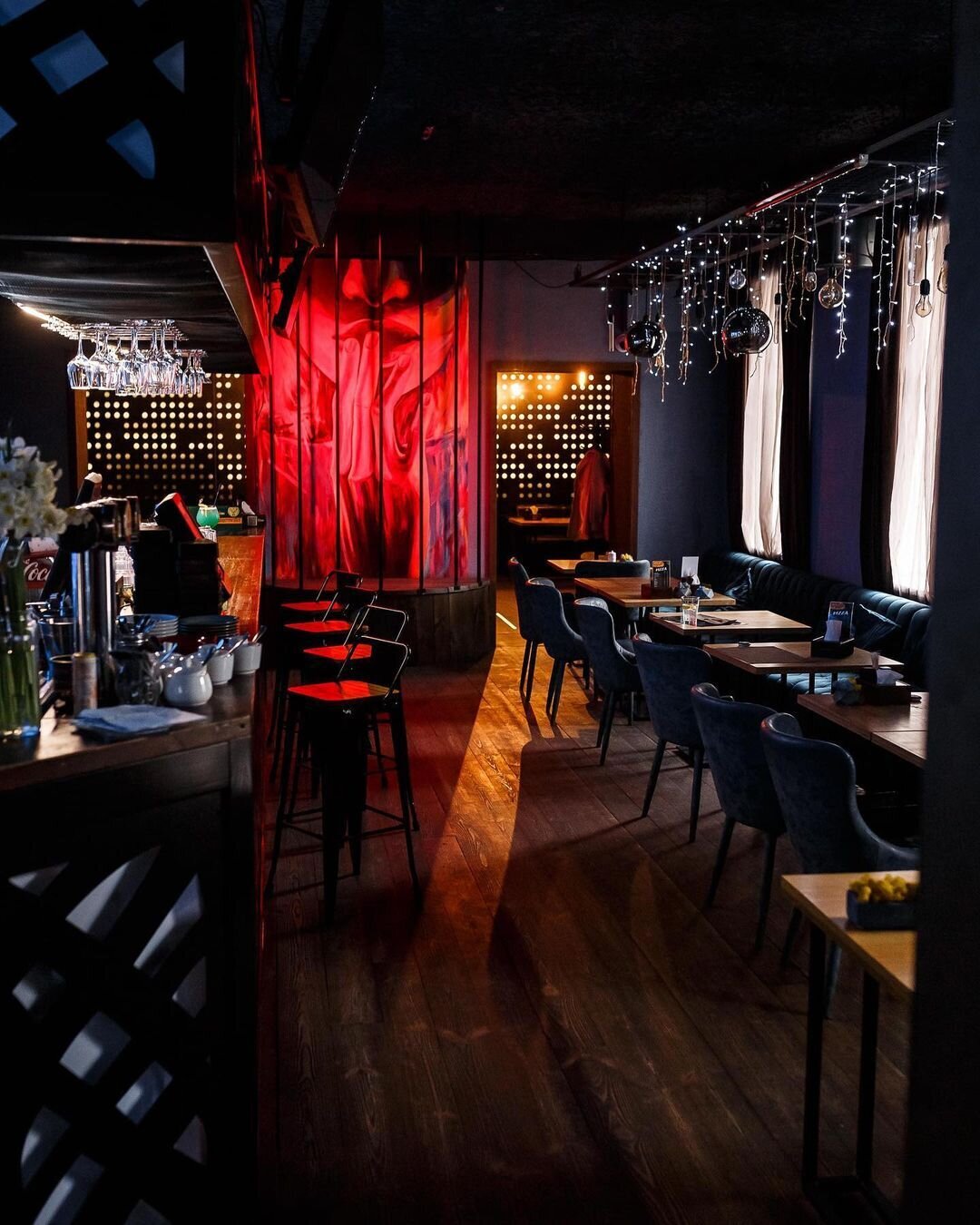 A bar with original cuisine and cocktails. The menu includes cold and hot appetizers, burgers, sushi, rolls, salads, and desserts. The concept of the establishment is a party bar with discos and sets from DJs.