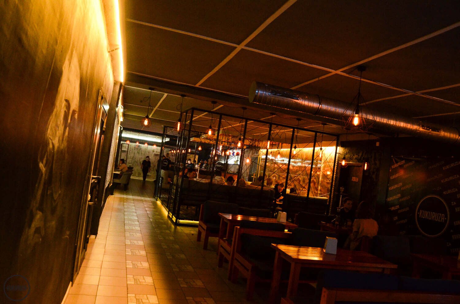 A bar with a lounge area for comfortable relaxation. The menu offers a variety of snacks, pizzas, and burgers. There is a wide selection of alcoholic and non-alcoholic beverages. They also have a signature corn-based menu.