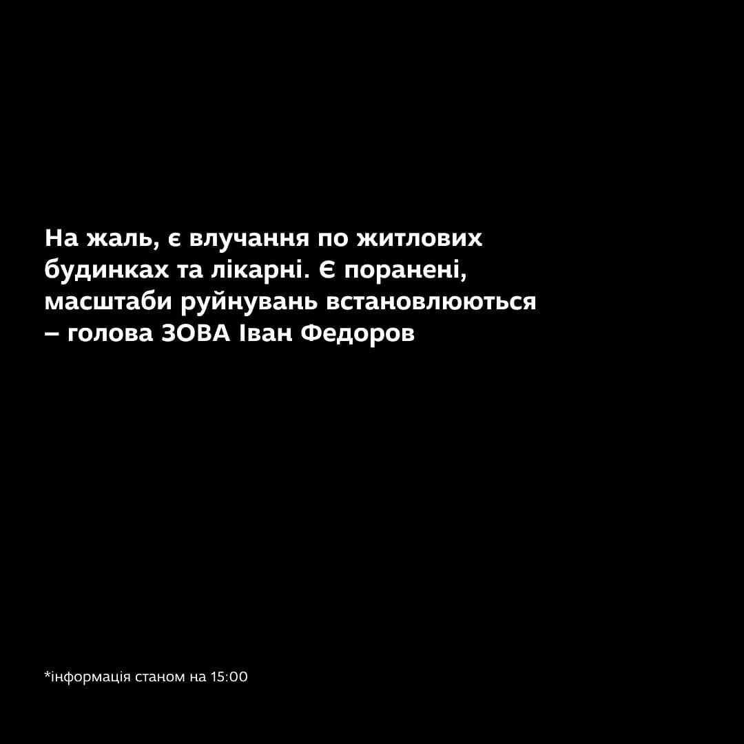 На жаль, є влучання по житлових будинках та лікарні. Є поранені, масштаби руйнувань встановлюються - за інформацією очільника ЗОВА Івана Федорова.