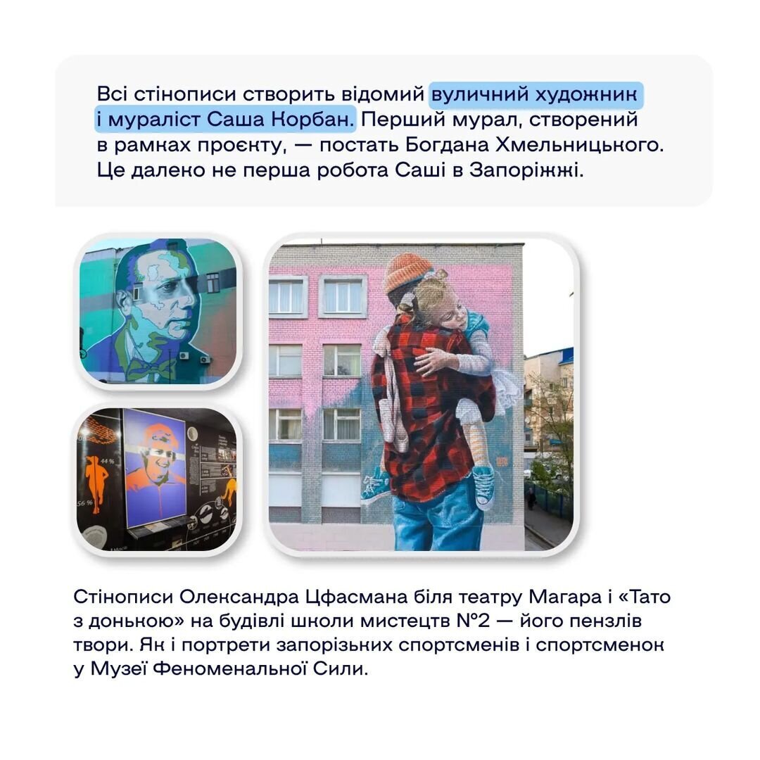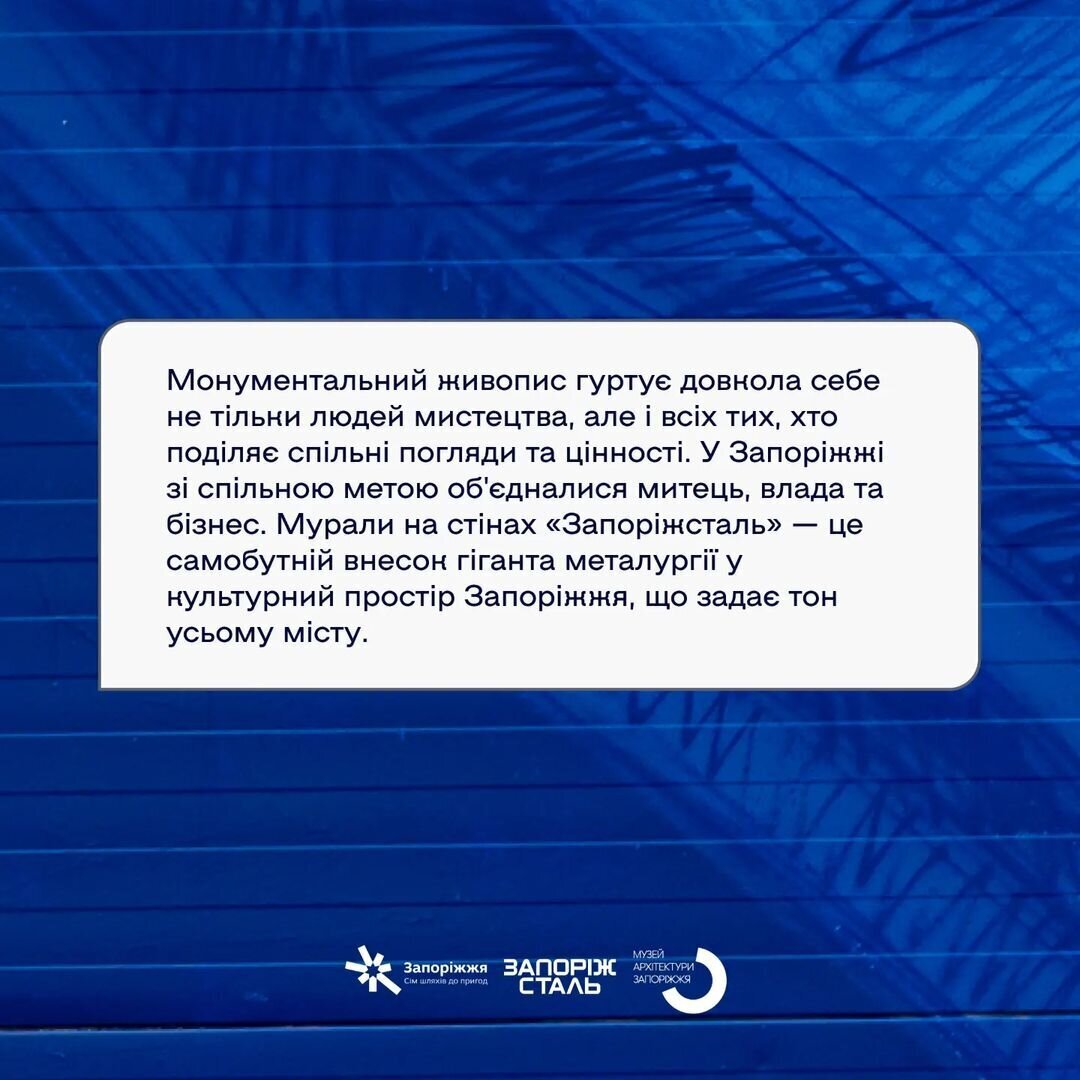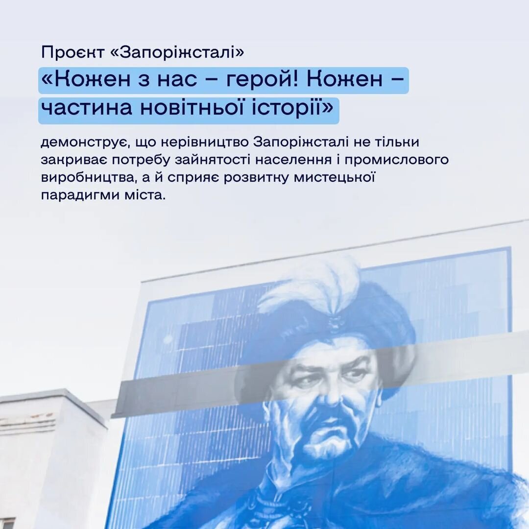Стінописи від художника Саші Корбана @sasha.korban створять чіткий дзеркальний зв'язок між історичними постатями України та працівниками комбінату. Акцентують на тому, що наша нація, крізь роки історії, залишається героїчною. І весь колектив «Запоріжсталі» сьогодні — герої, які щоденно, невпинно та віддано працюють заради майбутнього.