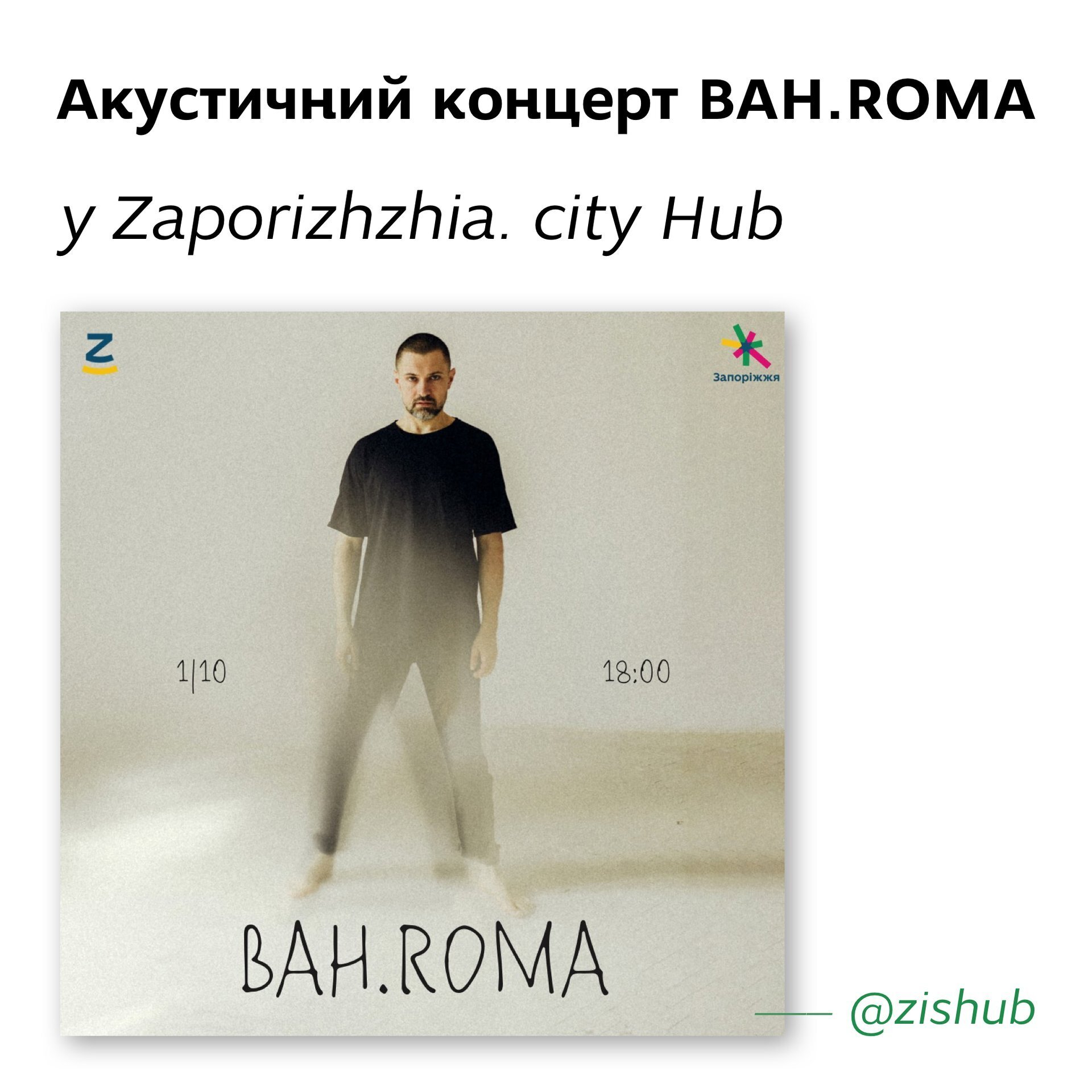 ОНОВЛЕНО: концерт переноситься на 12 листопада. Акустичний перформанс від BAH.ROMA у Запоріжжі. Що може бути тепліше восени, ніж підспівувати улюбленому виконавцю пісні під гітару? Це буде швидше схоже на зустріч старих друзів: душевно, камерно, з жартами і розмовами про важливе - інакше у BAH.ROMA не буває.