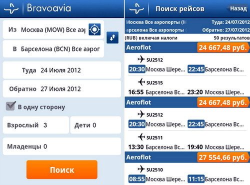 У Bravoavia.ru дійсно зручний додаток для пошуку дешевих авіаквитків серед сотень рейсів. Ціна квитка, тривалість перельоту, час вильоту і прибуття, пересадки — всі ці деталі тепер доступні в вашому телефоні, як для iPhone, так і для Android.