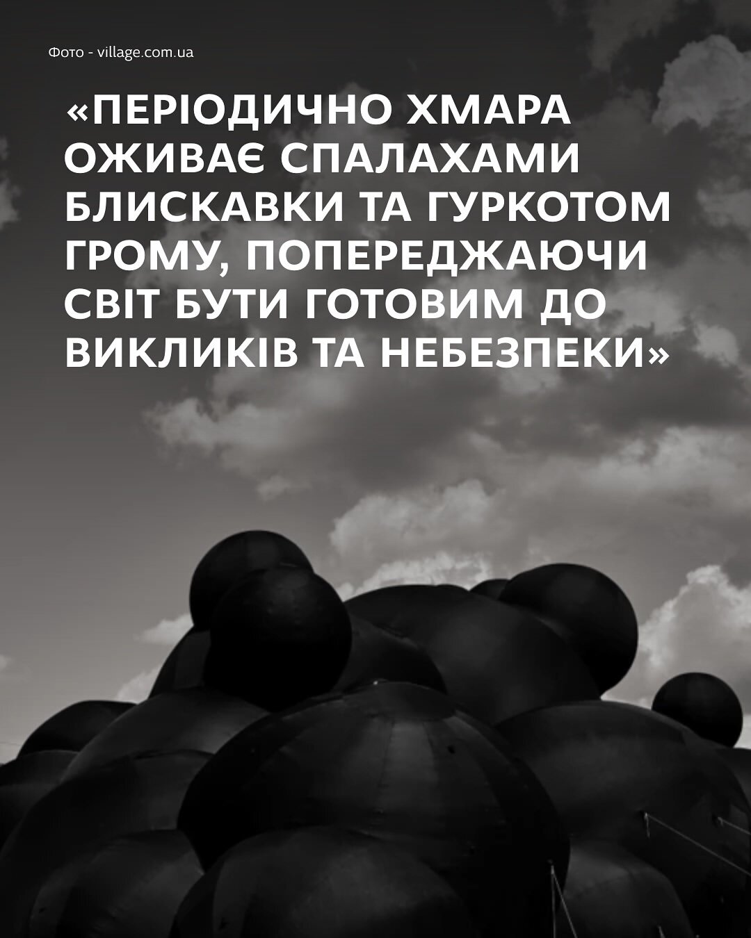 Форма відсилає до дитячого зображення грозової хмари — простої, проте тривожної. Як зазначають автор проєкту Олексій Сай @oleksiysai та продюсер Віталій Дейнега @deynega.vit, інсталяція періодично «оживає» — блискавками та гуркотом грому, попереджаючи про загрози, що можуть з’явитися раптово.