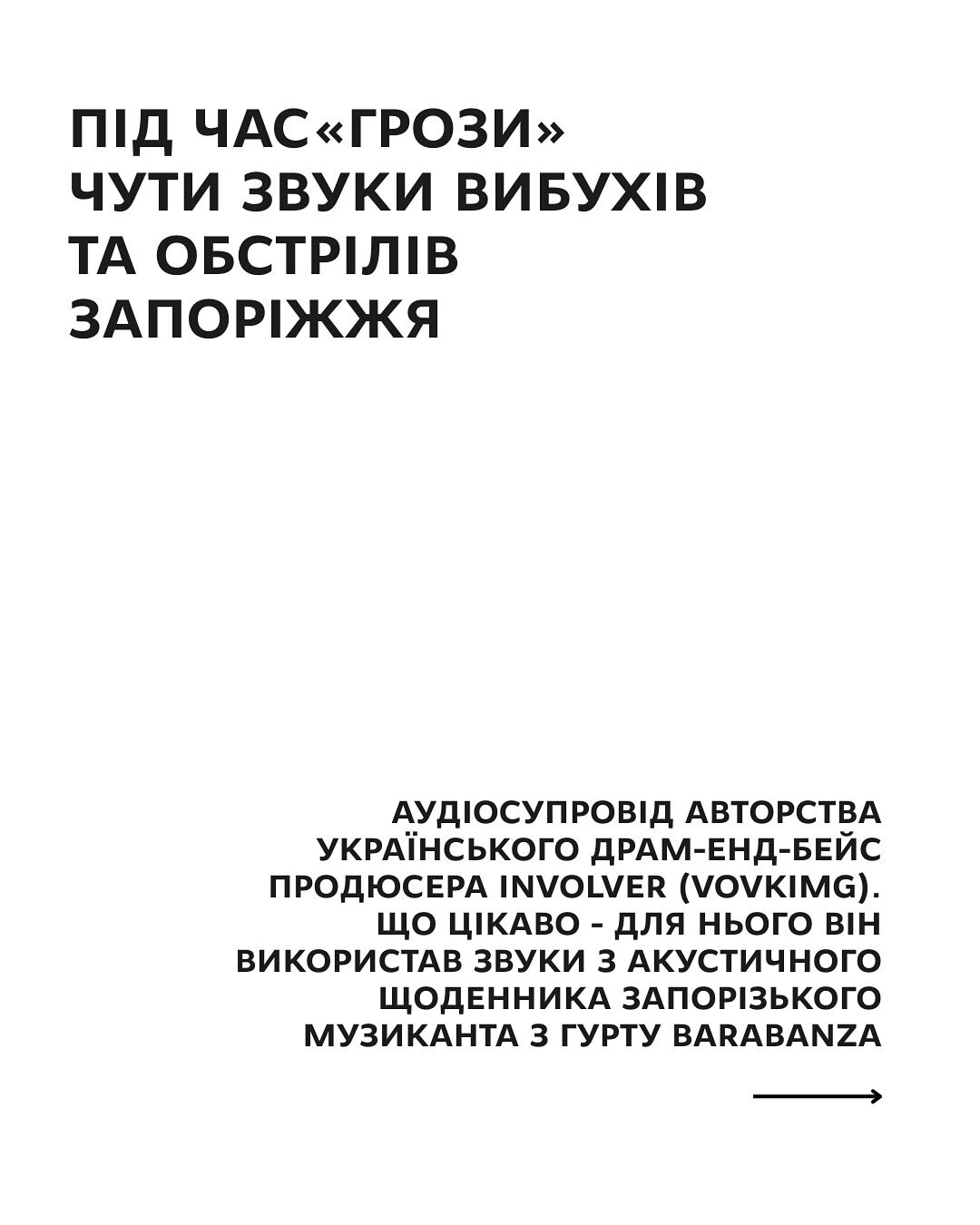 Для звукового оформлення український продюсер Involver (VovKIMG) використав записи з акустичного щоденника запорізького музиканта з гурту Barabanza — у моменти «грози» звучать вибухи та обстріли Запоріжжя.