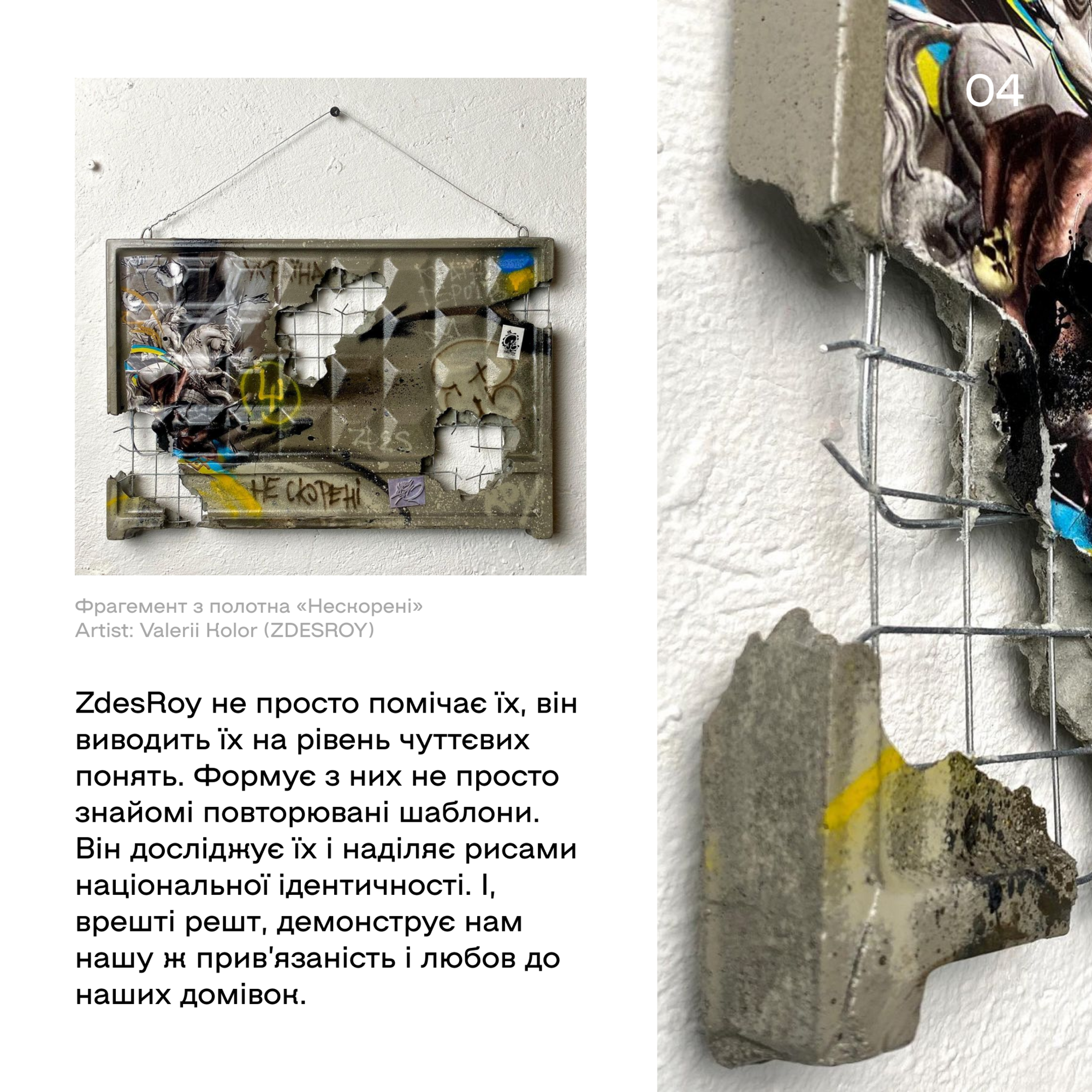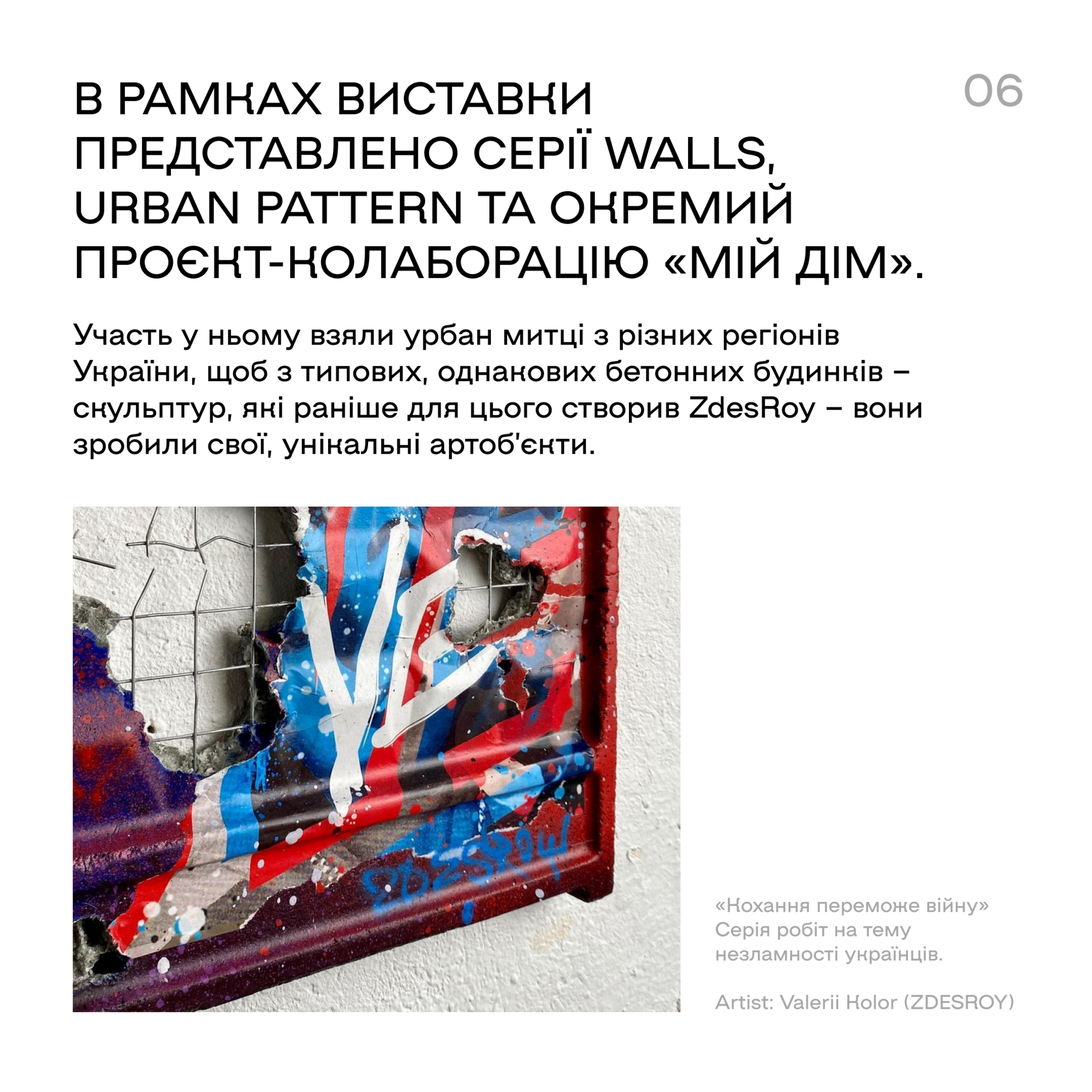 ZdesRoy - один з найвідоміших urban митців, чиї роботи є у багатьох містах України та Європи. Серед них стінописи, графіті, інсталяційні форми. Учасник масштабних street art фестивалів і виставок. Свого часу виробник фарби Montana Colors визнав його найактивнішим вуличним художником України.