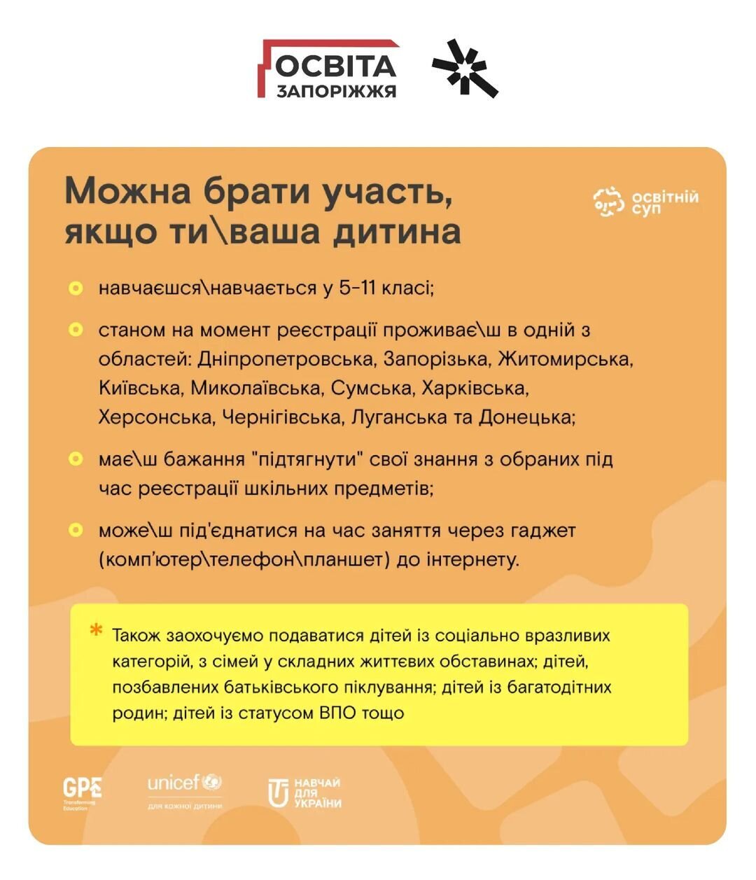 Умови для участі: ✅ ви навчаєтесь у 5-11 класах; ✅ ви проживаєте у Дніпропетровській, Запорізькій, Житомирській, Київській, Миколаївській, Одеській, Сумській, Харківській, Херсонській, Чернігівській, Луганській чи Донецькій області (або маєте статус ВПО з цих областей).