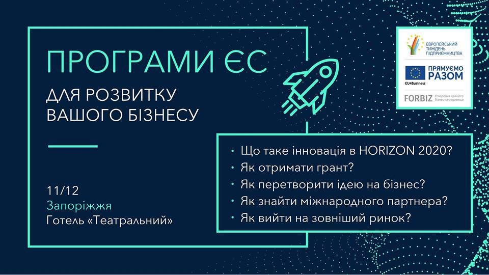Маєте інноваційну бізнес-ідею, але не знаєте як її втілити? Або Вам довподоби модель західного бізнес-бачення і можливо мрієте про міжнародних партнерів? Долучайтесь до серії тренінгів та дізнайтесь як програма HORIZON 2020 може допомогти перетворити Ваш задум на успішний бізнес, а Європейска мережа EEN - знайти бізнес-партнерів з більше ніж 60 країн світу!