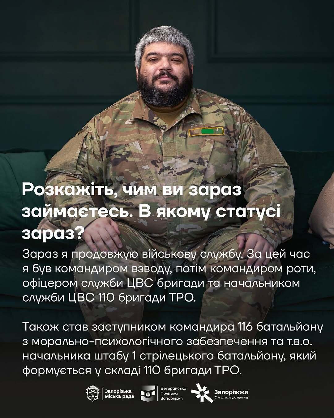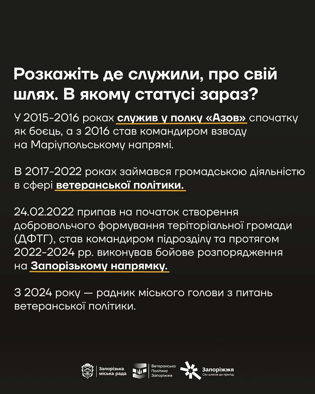 Михайло Пирог пройшов непростий шлях, служив у полку «Азов» та добровольчому підрозділі, а тепер протягом тривалого часу розвиває Ветеранську політику в Запоріжжі.