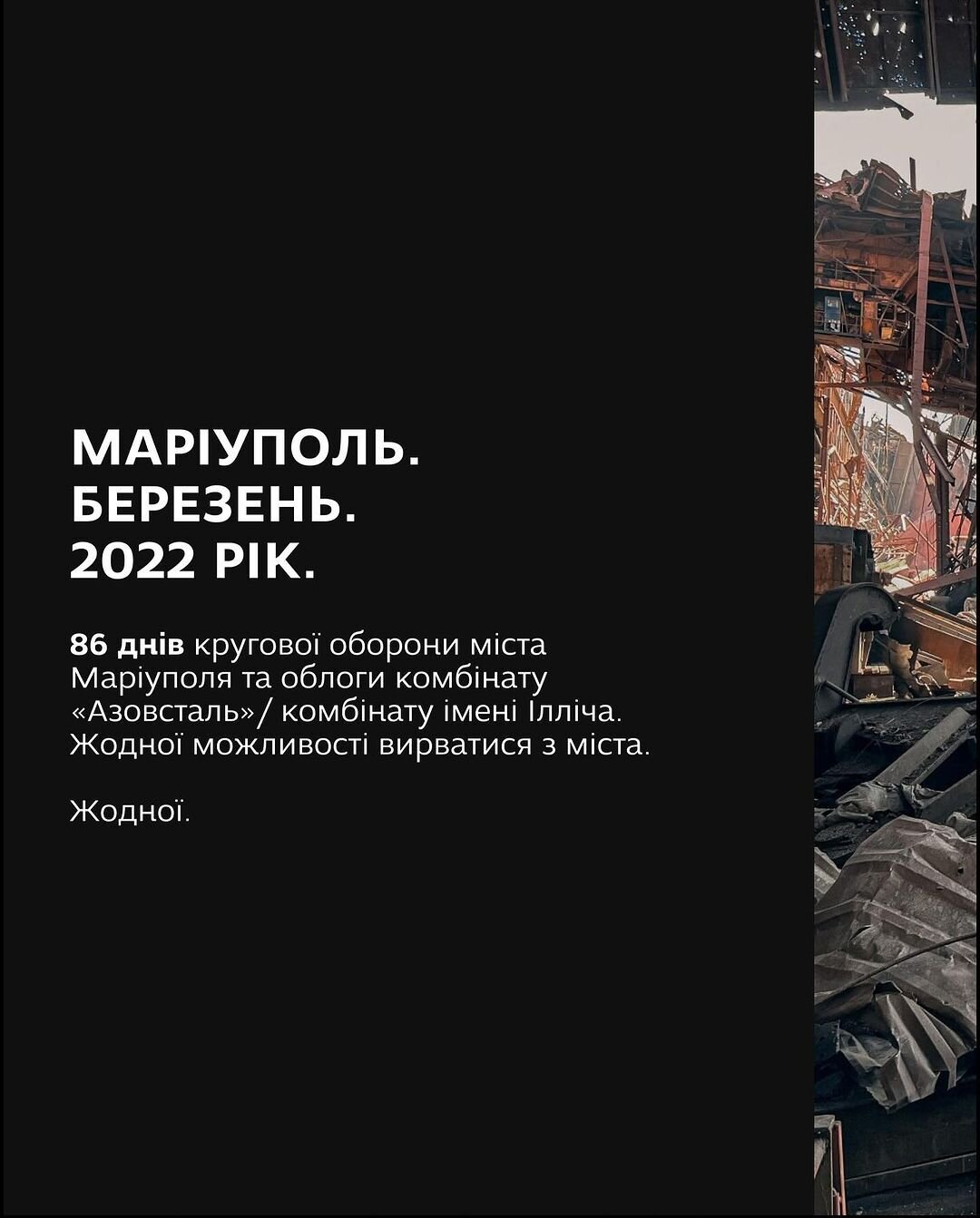 Вони ті, хто продовжували обороняти місто та давати відсіч ворогу навіть у повному оточенні. Вони ті, хто до останнього не складали зброю і продовжували боротися навіть тоді, коли не було жодного шансу на свободу. Коли місто перебувало у повній блокаді, вони були маленькою надією на велике майбутнє. 86 днів кругової оборони міста Маріуполя та облоги комбінату «Азовсталь»/ комбінату імені Ілліча. Жодної можливості вирватися з міста. Жодної.