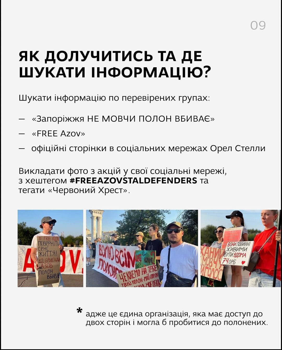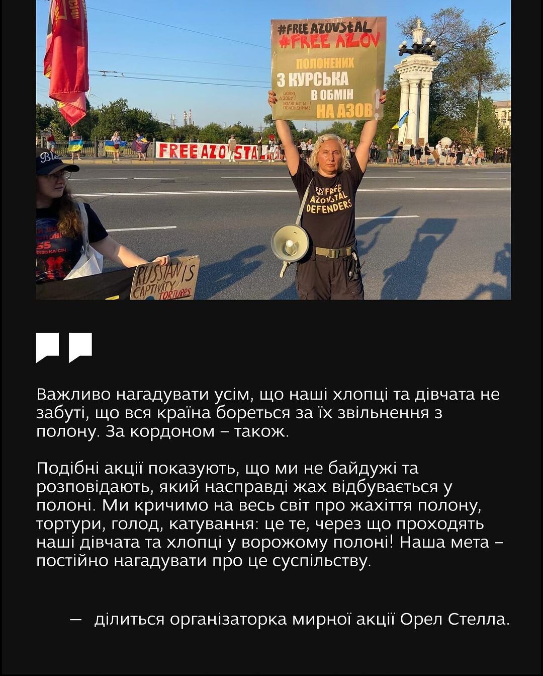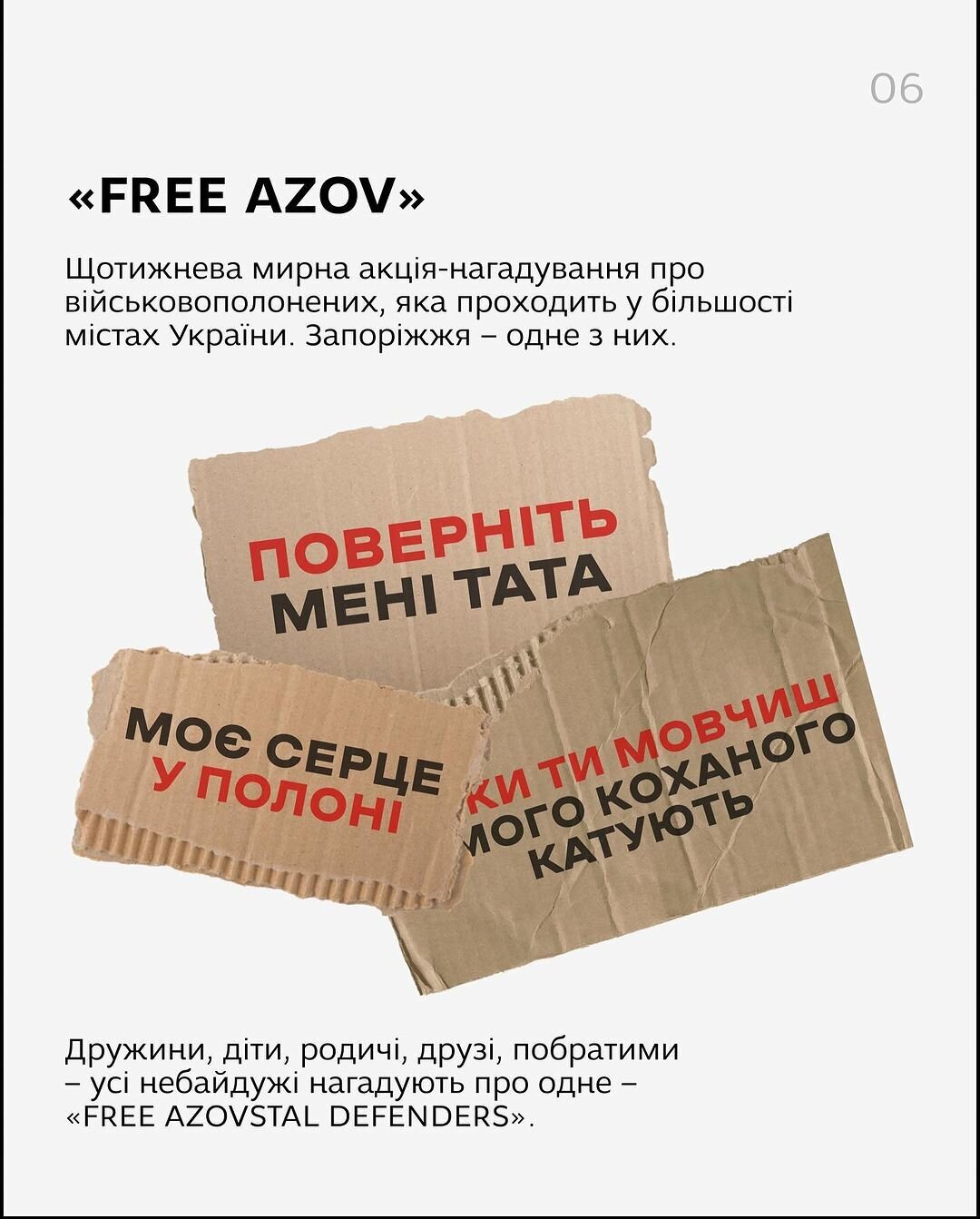 «Free Azov»: щотижнева мирна акція-нагадування про військовополонених, яка проходить у більшості містах України. Запоріжжя – одне з них. Щонеділі мешканці та гості міста виходять на вулицю, щоб стають одним єдиним голосом болю – голосом усіх військовополонених. Дружини, діти, родичі, друзі, побратими – усі небайдужі нагадують про одне – «FREE AZOVSTAL DEFENDERS».
