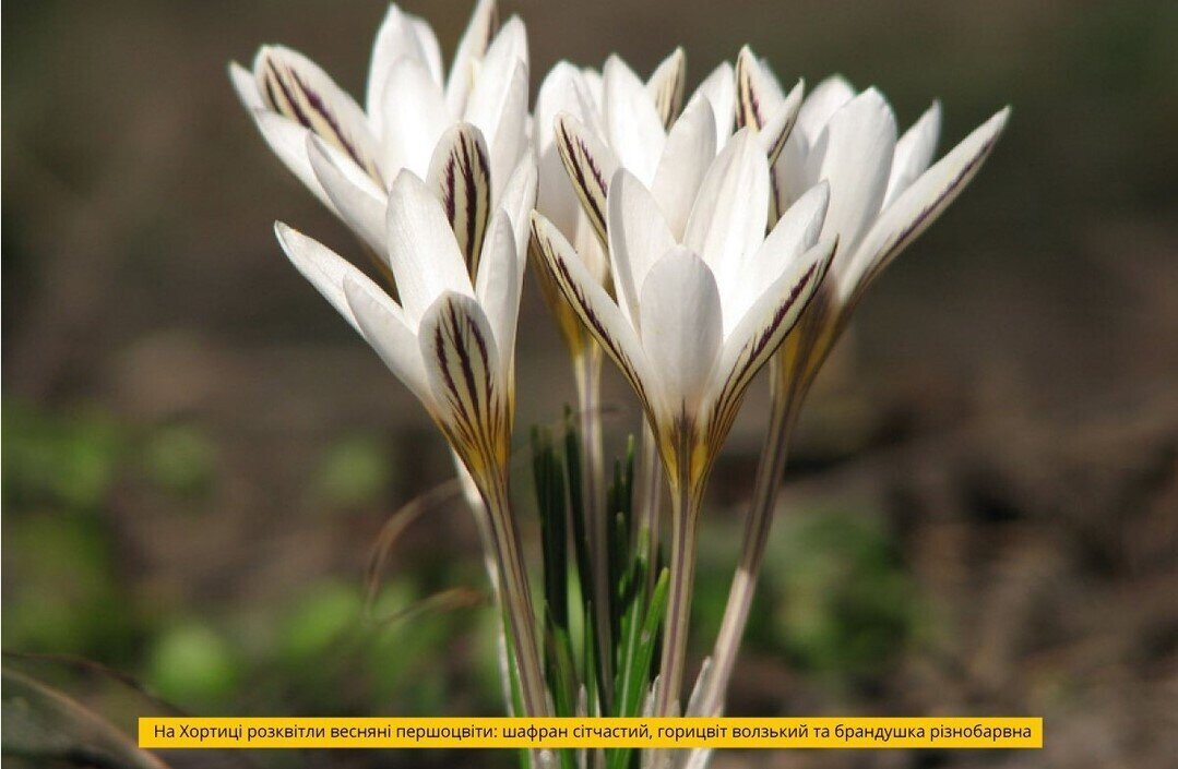 - На Хортиці розквітли весняні першоцвіти: шафран сітчастий, горицвіт волзький та брандушка різнобарвна. Ці квіти занесені до Червоної книги України.