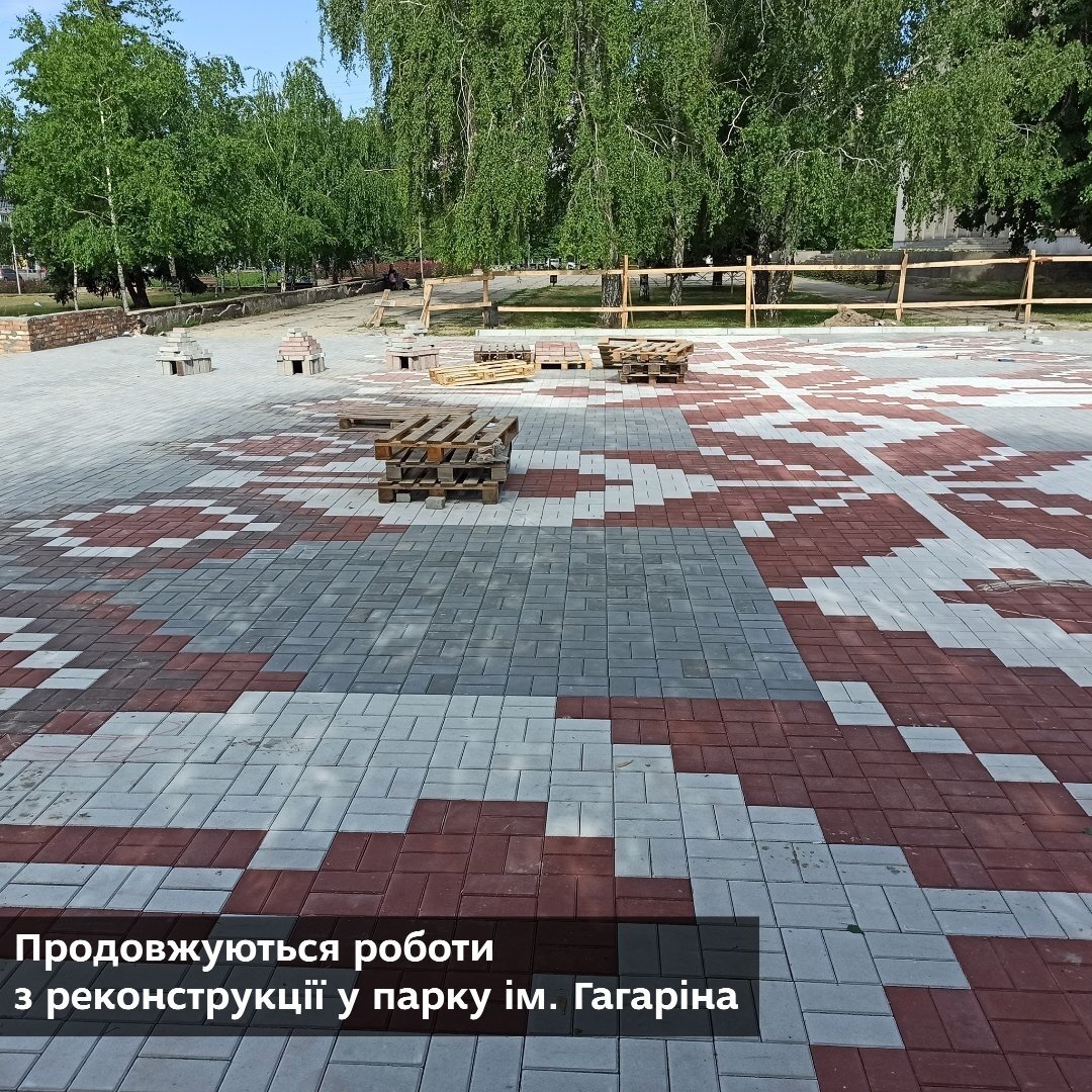 Продовжуються роботи з реконструкції у парку ім. Гагаріна. Наразі виконуються роботи з облаштування пішохідної зони скверу, заміна частини мощення та сходів. У парку також з'являться оновлені зелені зони, буде встановлено сучасне зовнішнє освітлення.