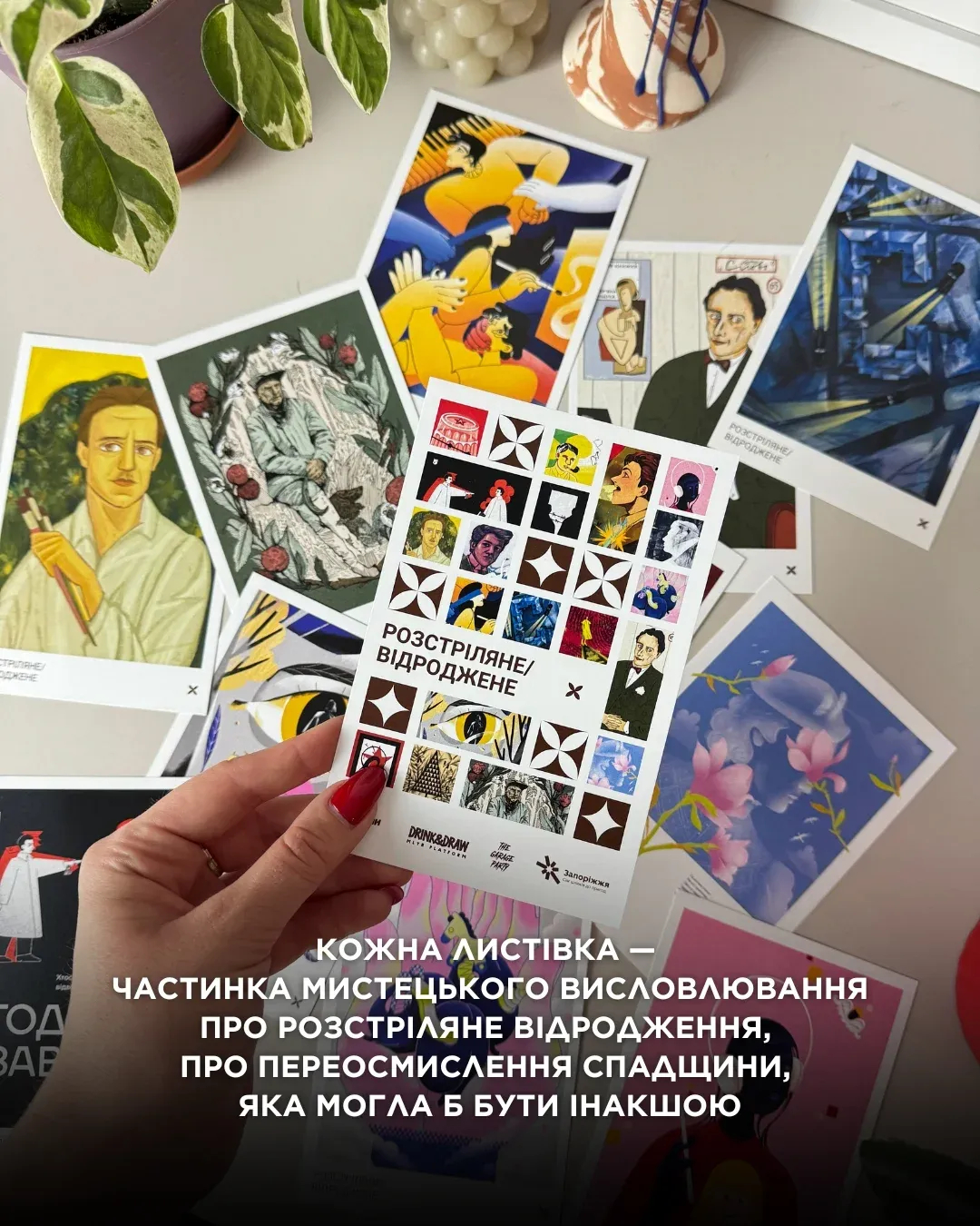 Кожна листівка — частинка мистецького висловлювання про Розстріляне Відродження, про переосмислення спадщини, яка могла б бути інакшою. Таких листівок не було і більше не буде: це лімітований випуск, створений спеціально до виставки.