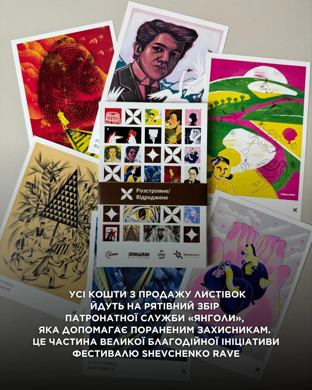 Усі кошти з продажу листівок йдуть на Рятівний збір Патронатної служби «Янголи» @ab3.angels, яка допомагає пораненим захисникам. Це частина великої благодійної ініціативи фестивалю Shevchenko Rave.