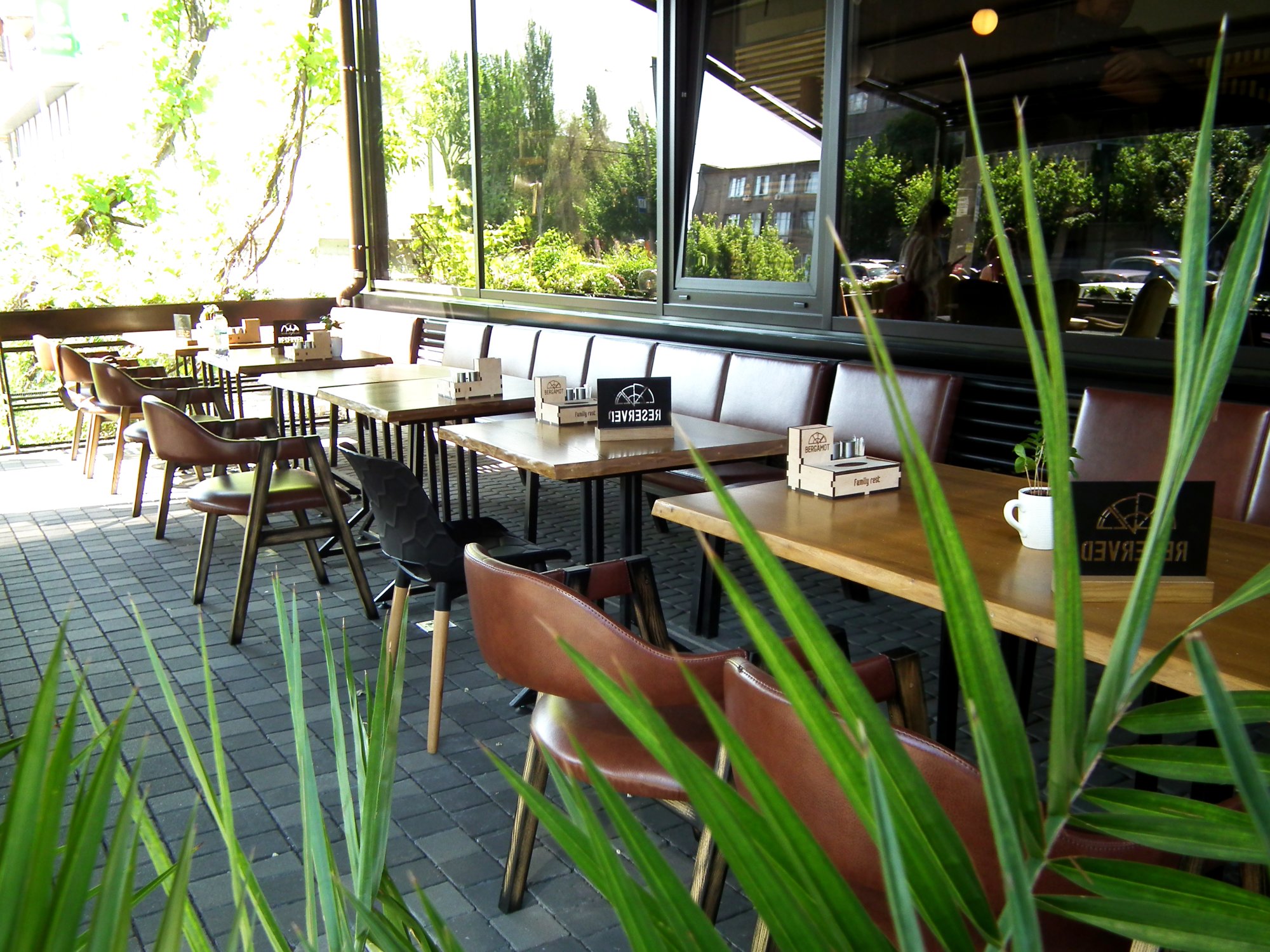 В інтер’єрі використано дерево, бетон, чорний метал. Скляні світильники та підвіски, рослини. Через панорамні вікна можна помилуватися видами вулиці. В залі розмістилася велика піч.