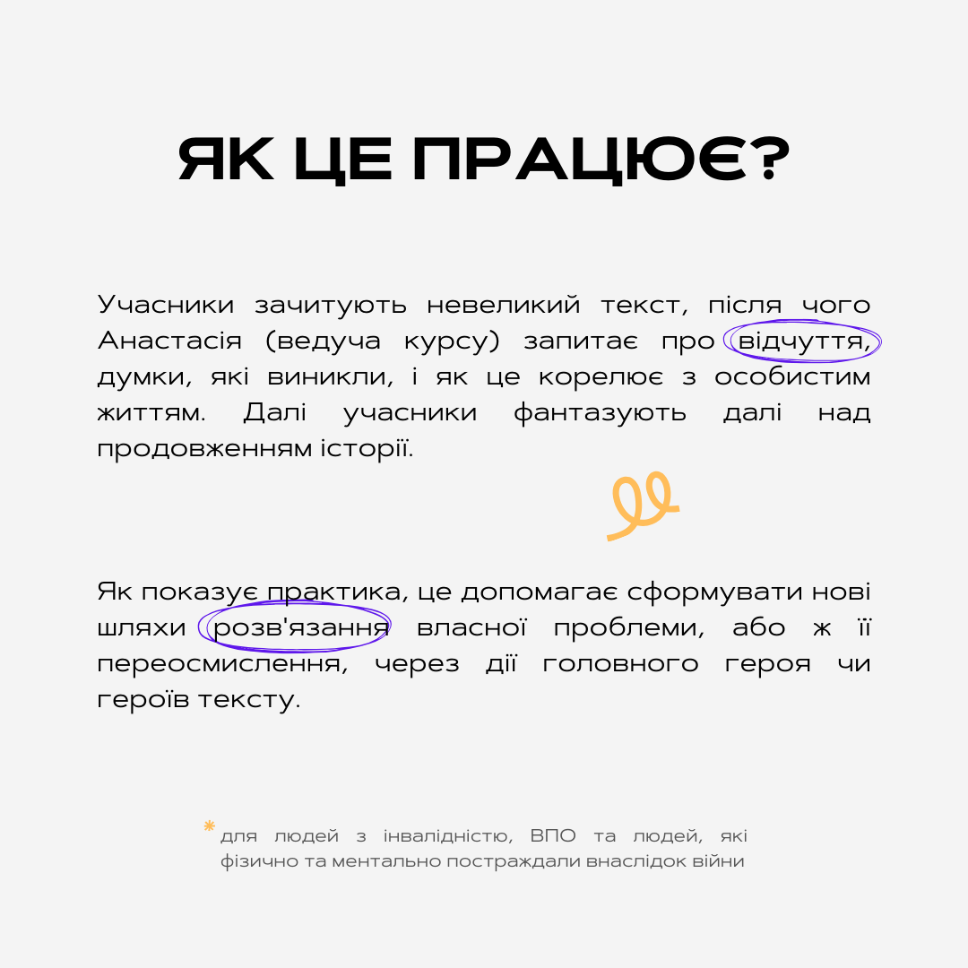 Це – новий і заснований на методі арттерапії проєкт з регулярними зустрічами для дорослих. Він передбачає використання літератури як інструменту для самоаналізу і покращення психологічного стану людини. Модератором заходу виступить психологиня Анастасія Станіщук.