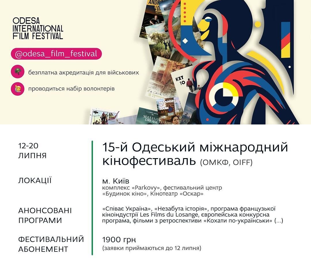 Цього липня відбудеться 15-й Одеський міжнародний кінофестиваль, який посідає особливе місце в серцях як кіновиробників, так і глядачів. Родом з незламної кіностолиці України — м. Одеса, цьогоріч відбудеться у столиці каштанів та культурного життя — м. Києві. Квитки на подію вже доступні, посилання — в шапці @odesa_film_festival