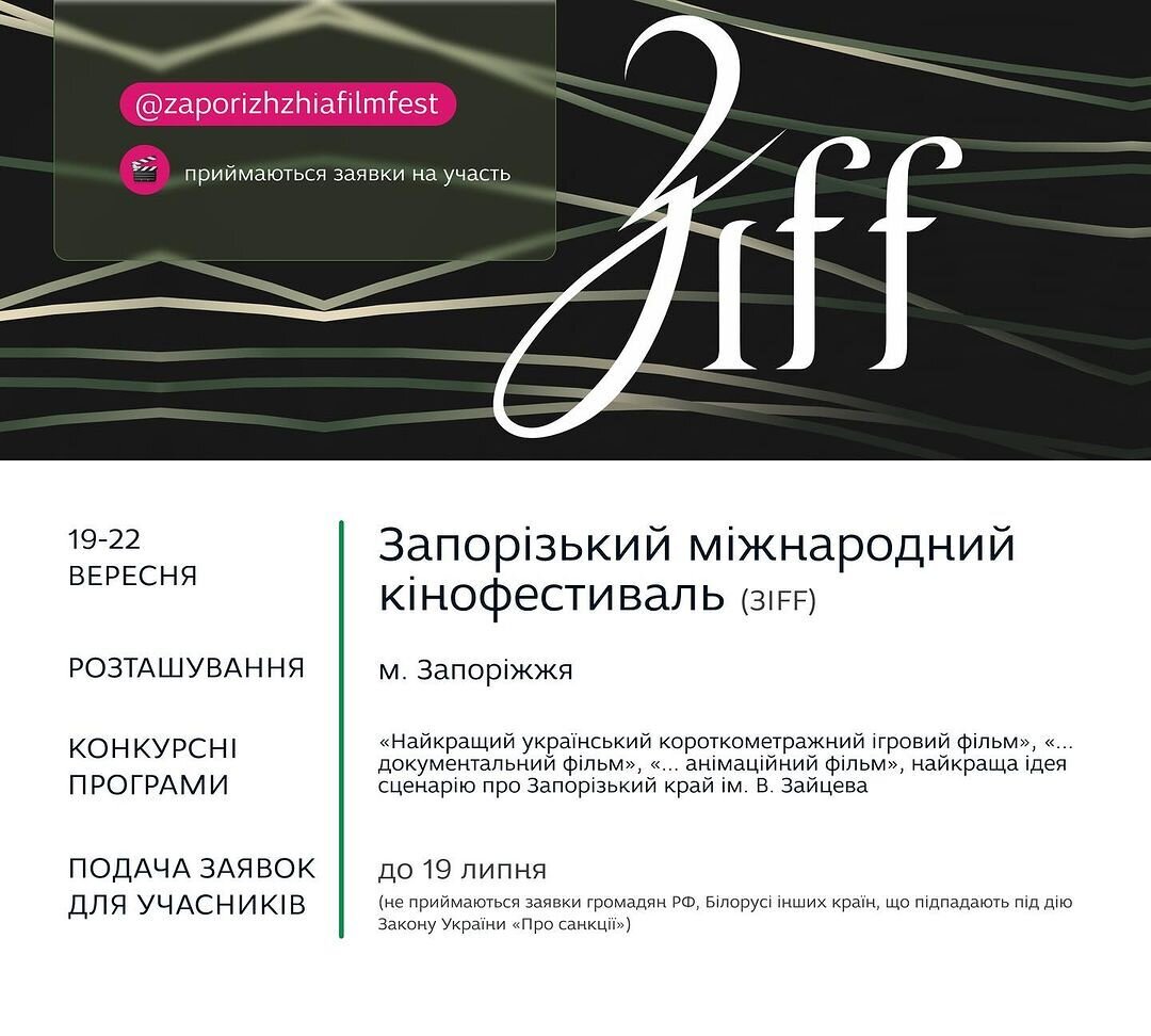 ЗIFF — ще одна масштабна культурна подія з незламного міста — нашого любого Запоріжжя. Оргкомітет фестивалю проводить конкурс на короткий метр та сценарні роботи, подробиці у профілі @zaporizhzhiafilmfest. Проведення фестивалю планується на третій тиждень вересня.