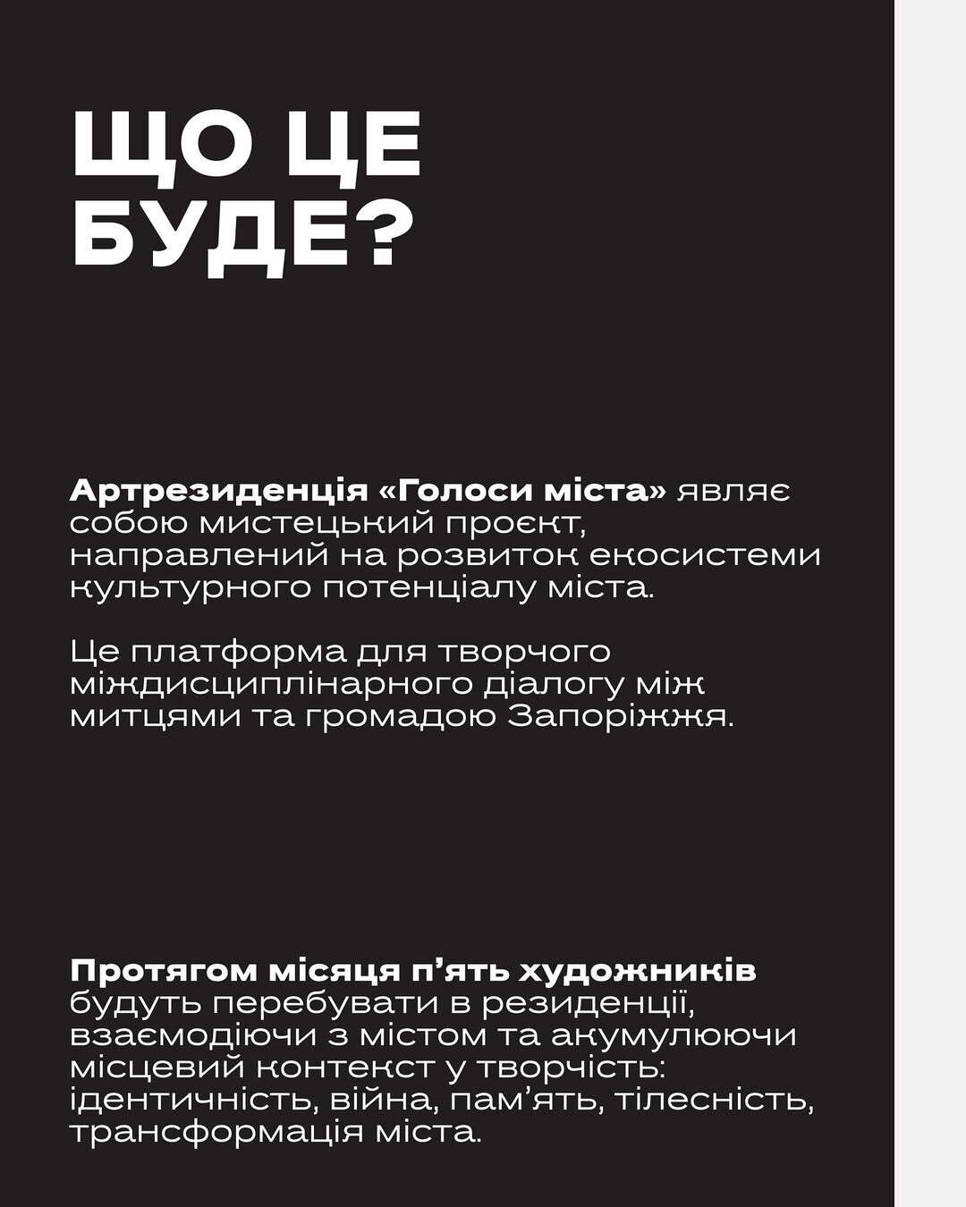 Ми оберемо 5 митців, чиї роботи стануть живим відлунням голосів міста та його людей.