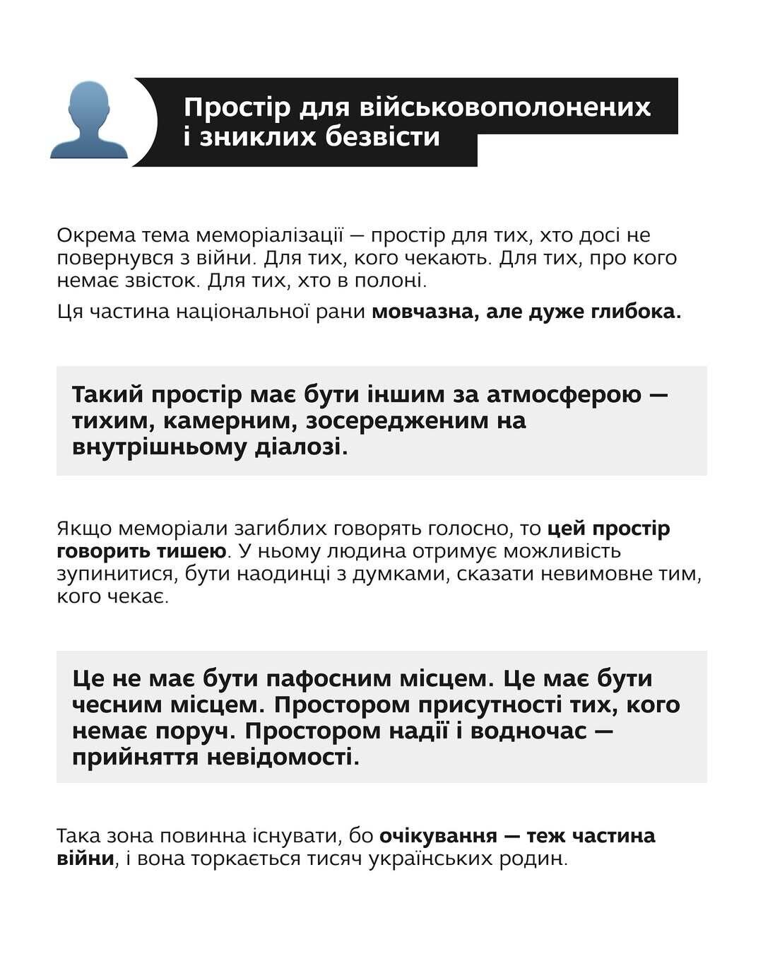 І якщо ми говоримо про нову культуру меморіалізації в Україні, то вона повинна починатися не з монументів, а з людини. З того, як ми передаємо пам’ять наступним поколінням і як працюємо з нею в суспільстві, яке живе у стані війни.