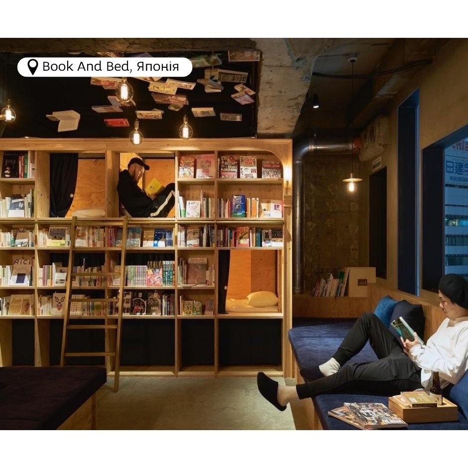 У цьому унікальному готелі любителі літератури можуть зануритися у світ книг майже у буквальному сенсі: діставшись другого ярусу “книжкового ліжка” і засинаючи серед книжкових полиць. Не треба говорити, що поціновувачам тихого інтелектуального відпочинку цей готель прийдеться до вподоби.