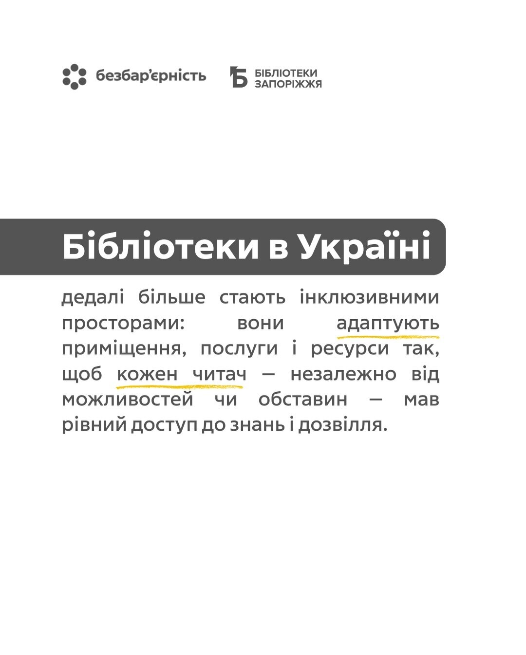 Бібліотеки в Україні дедалі більше стають інклюзивними просторами: вони адаптують приміщення, послуги і ресурси так, щоб кожен читач — незалежно від можливостей чи обставин — мав рівний доступ до знань і дозвілля.