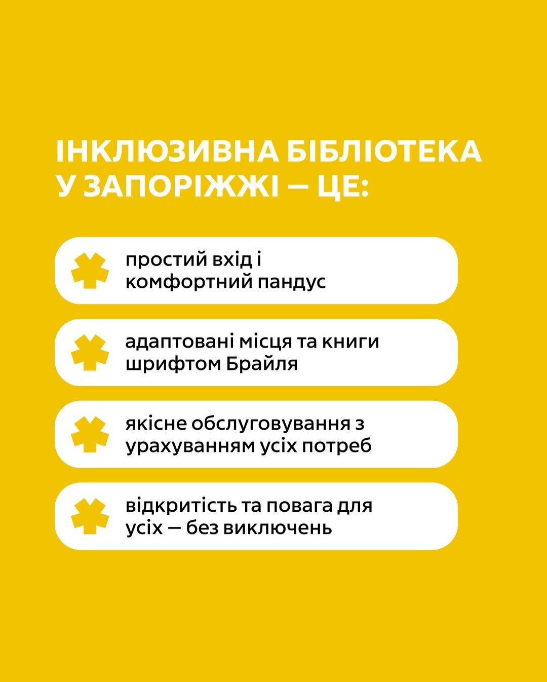Команда оновлених бібліотек Запоріжжя — не виключення. Наша перша інклюзивна бібліотека в запорізькому регіоні створена так, щоб усі могли комфортно проводити час, знаходити потрібні ресурси й насолоджуватися улюбленими книжками без зайвих перешкод. Це простір, де доступність — не опція, а норма.