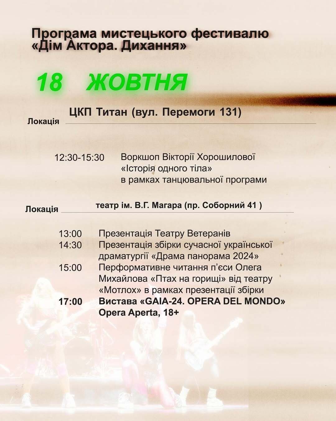 Обирайте мистецькі події 17-19 жовтня і ставайте А́кторами. Вистави, презентації, читання пʼєс та лекції - і все це у Запоріжжі, цього тижня. Квитки на спектаклі на сайті musin.zp.ua та сoncert.ua (посилання в шапці профілю @dimaktora) [gallery type=2 id=24230,24231,24232,24233]