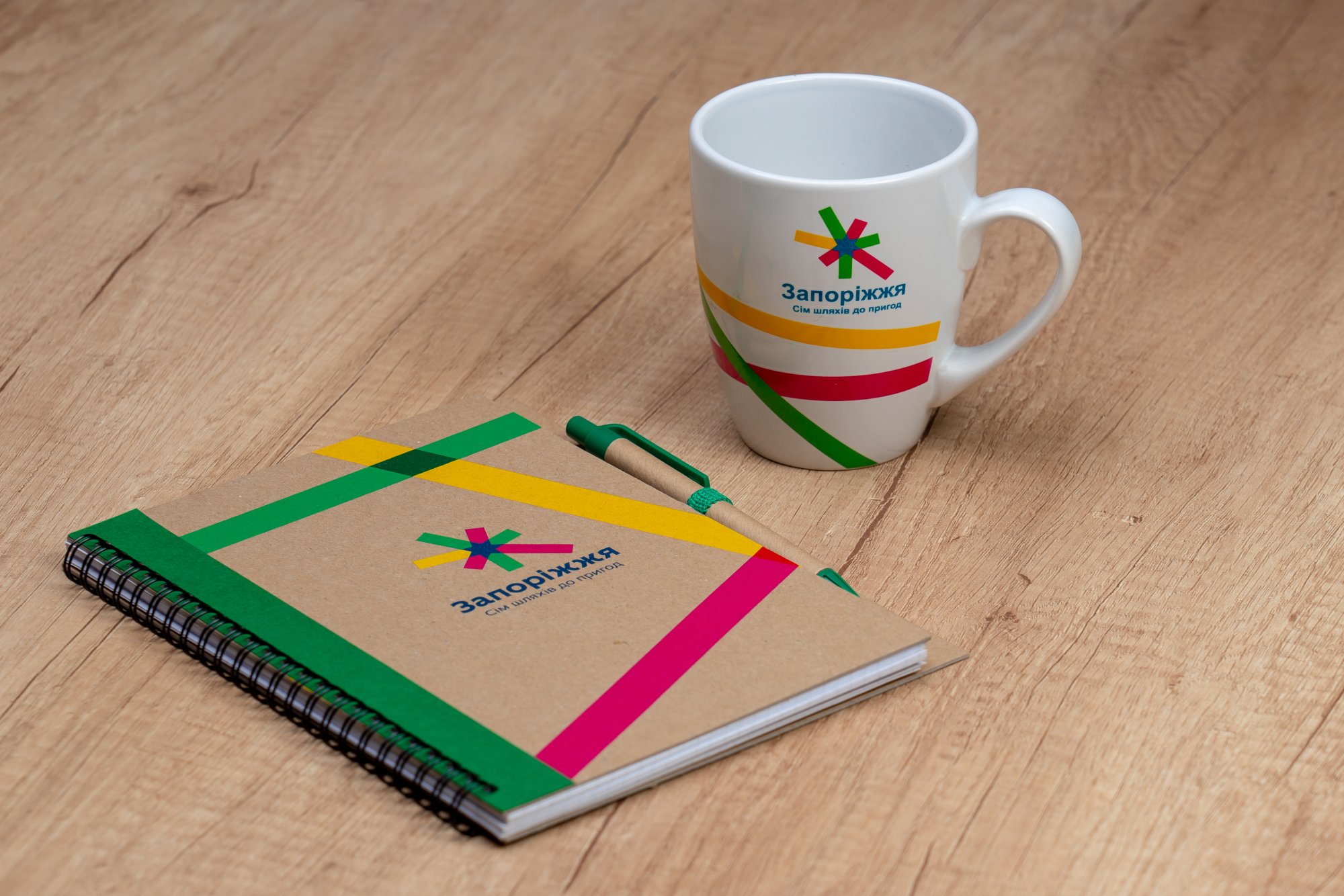 Наприклад на сайті Туристичного центру можна придбати шильди на телефон, листівки, магніти, чашки та поло, а також незамінні всесезонні аксесуари – парасольки та сумки. Предмети виконані у кольорах айдентики Запоріжжя.