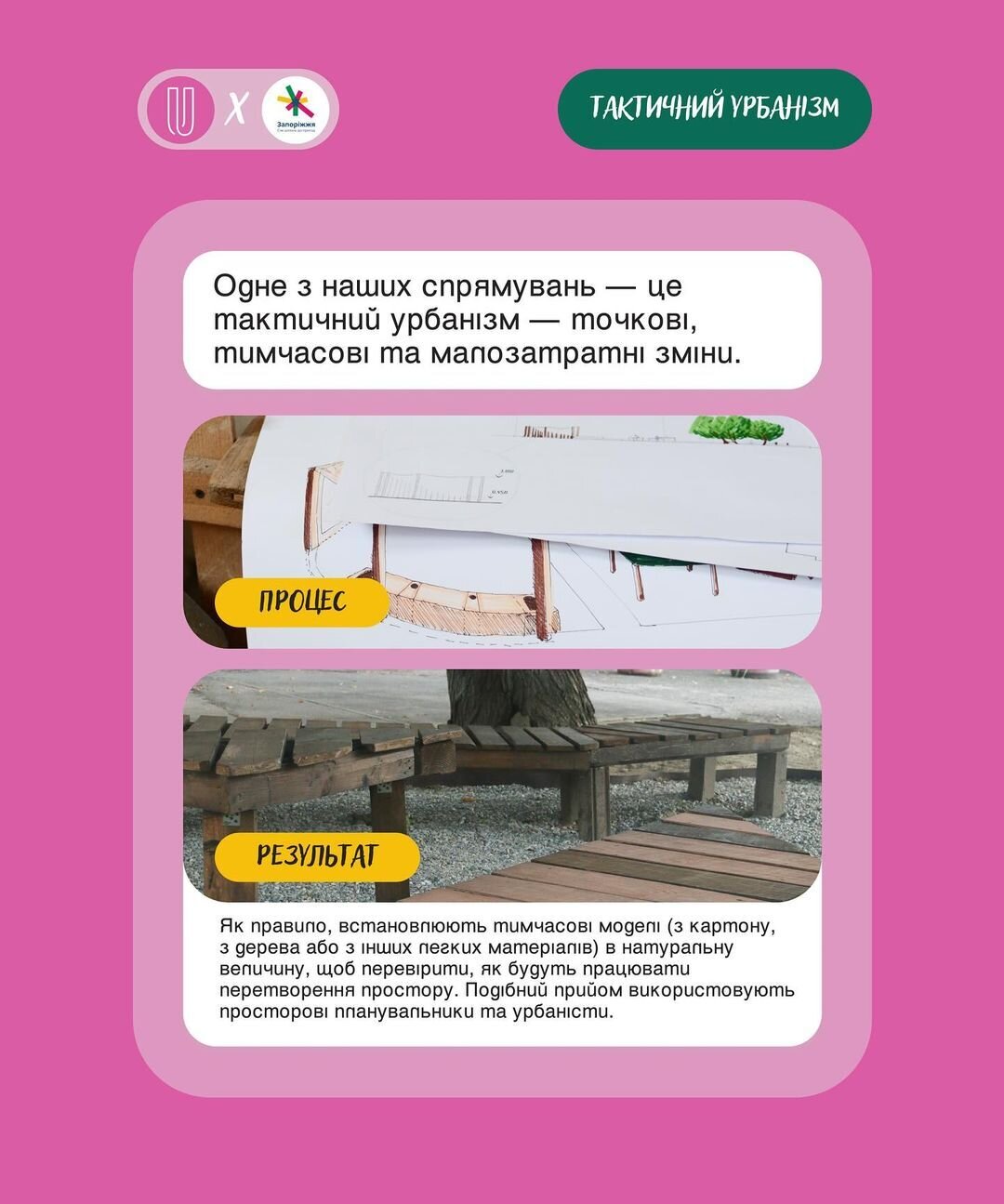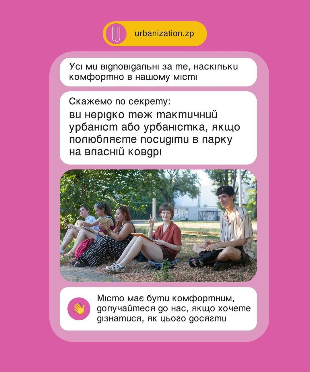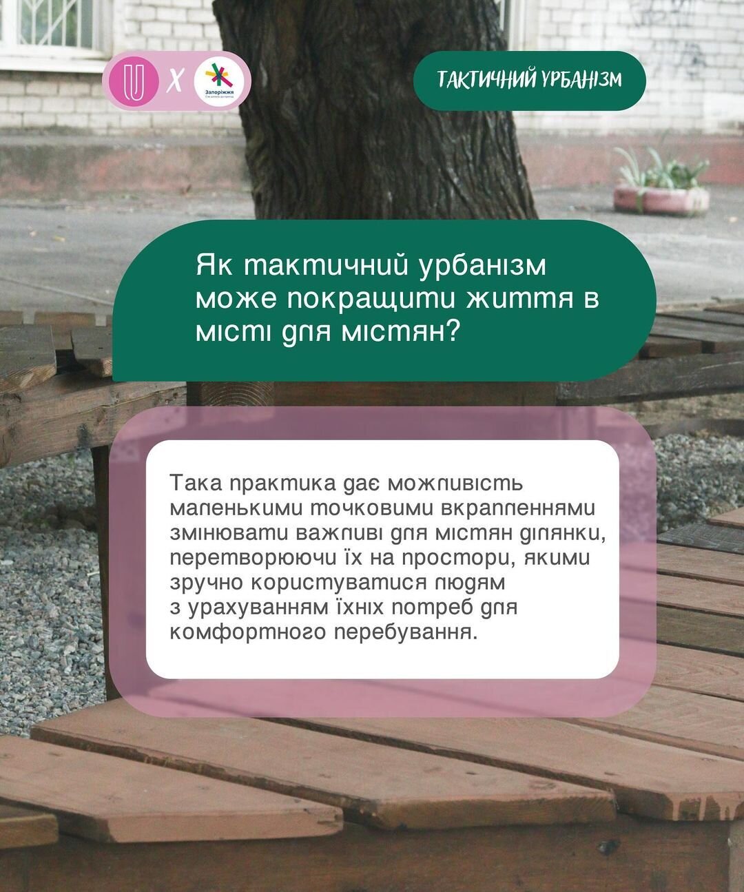 Спіймали винуватців міських мікро змін — команду @urbanization.zp і розпитали, чим вони займаються та навіщо. Дівчата і хлопці працювали над проєктом в галузі тактичного урбанізму — тимчасових змін у міському просторі, що зазвичай проявляється у нових вуличних меблях.