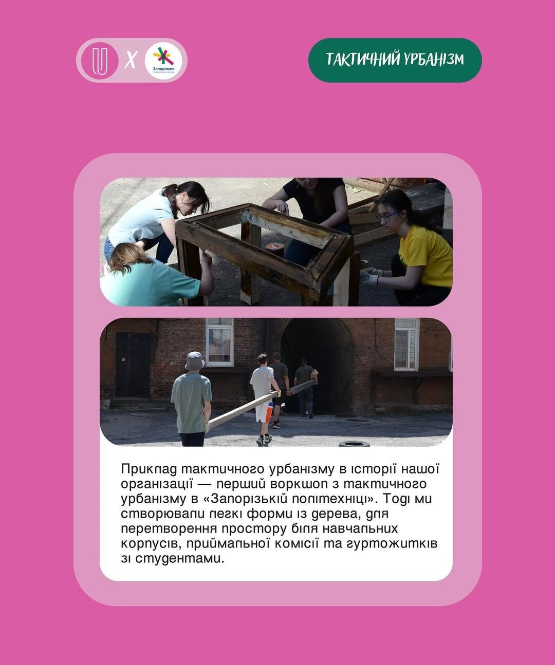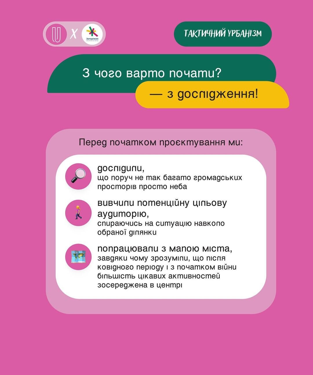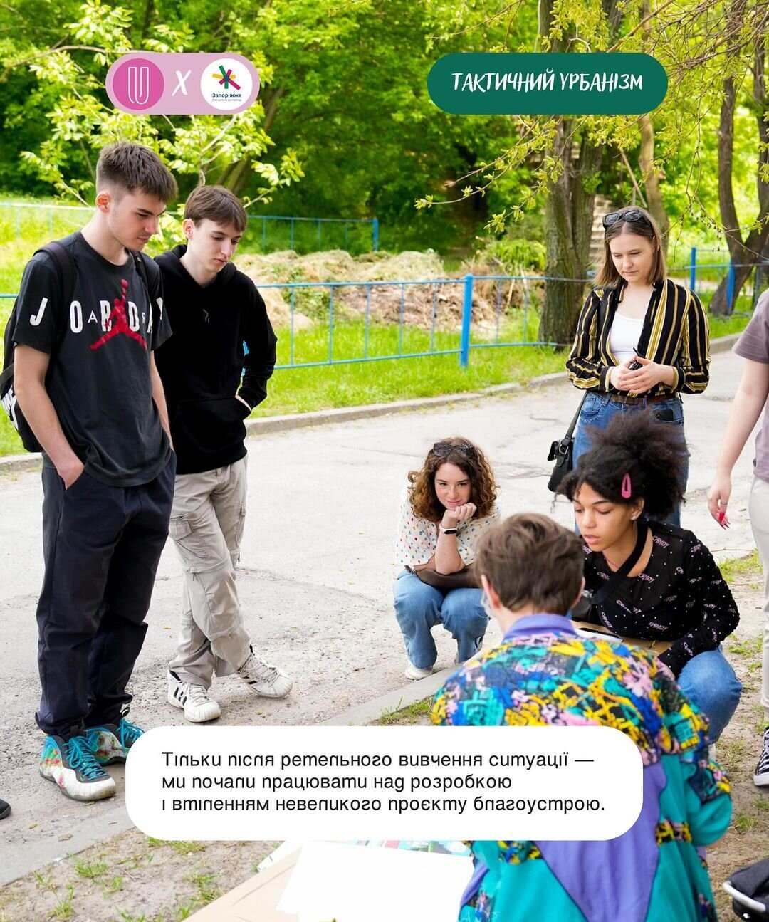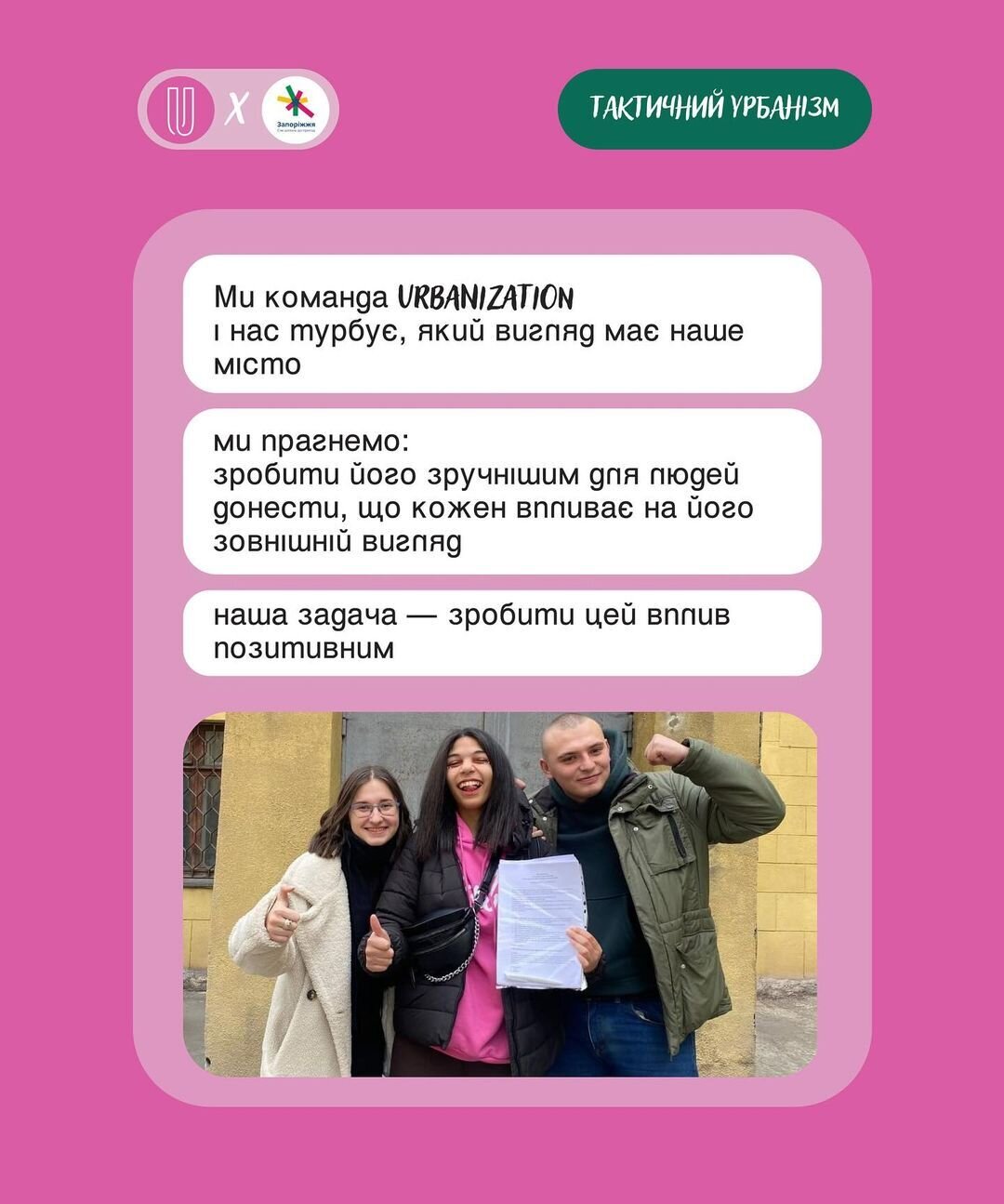 Спіймали винуватців міських мікро змін — команду @urbanization.zp і розпитали, чим вони займаються та навіщо. Дівчата і хлопці працювали над проєктом в галузі тактичного урбанізму — тимчасових змін у міському просторі, що зазвичай проявляється у нових вуличних меблях.