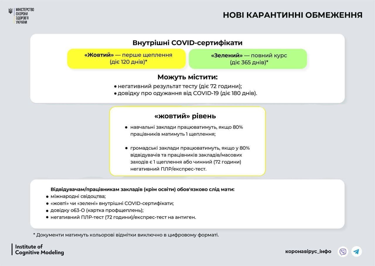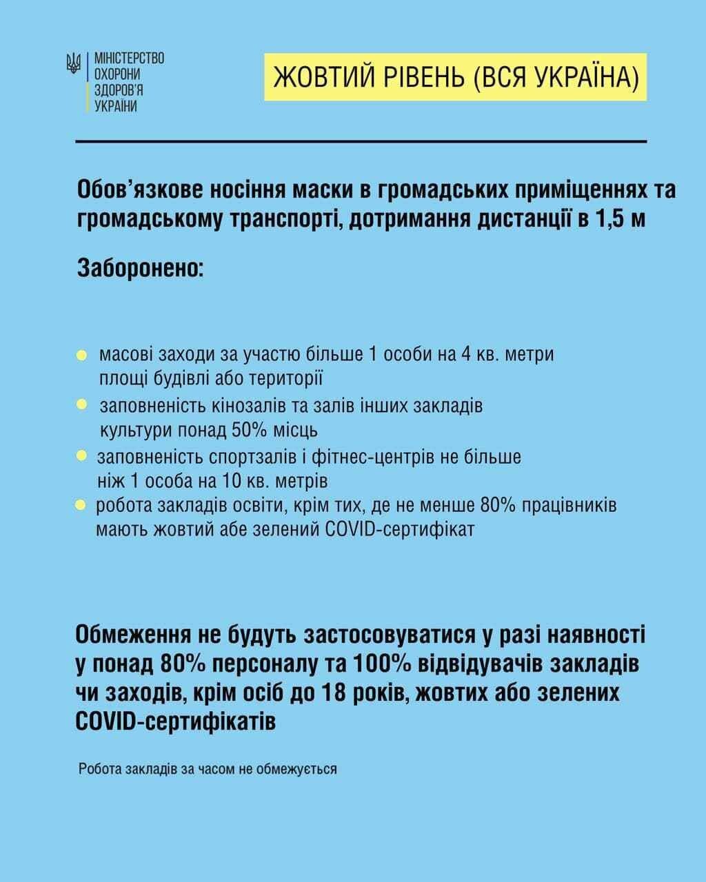 Обмеження не будуть застосовуватися у разі наявності у понад 80% персоналу та 100% відвідувачів закладів чи заходів, крім осіб до 18 років, "жовтих" або "зелених" COVID-сертифікатів.
