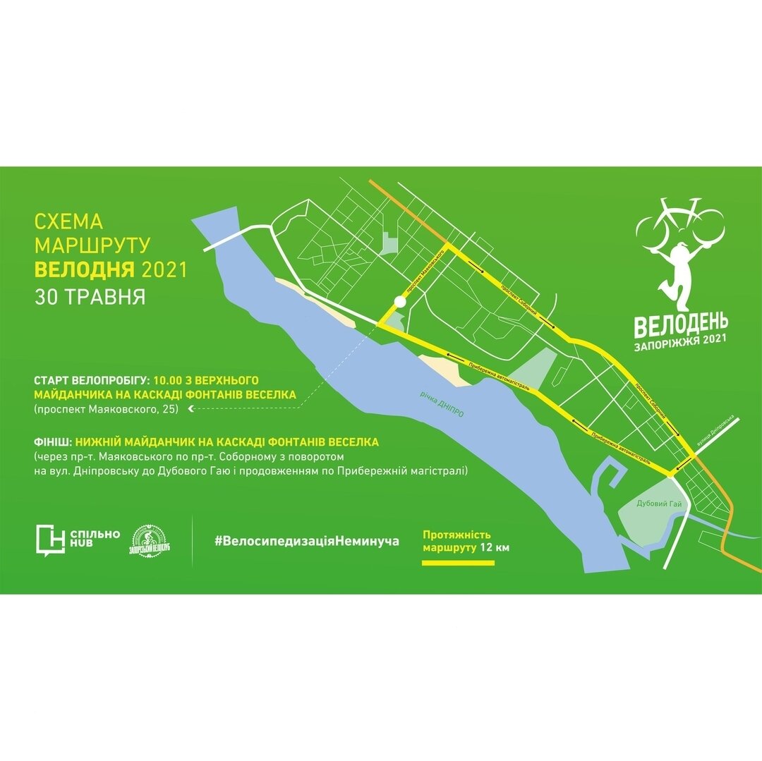 Старт: верхній майданчик каскаду фонтанів "Веселка". Далі учасники велопробігу проїдуть через пр. Маяковського по пр. Соборному з поворотом на вул. Дніпровську до Дубового Гаю та продовжать рухатись по Прибережній магістралі.