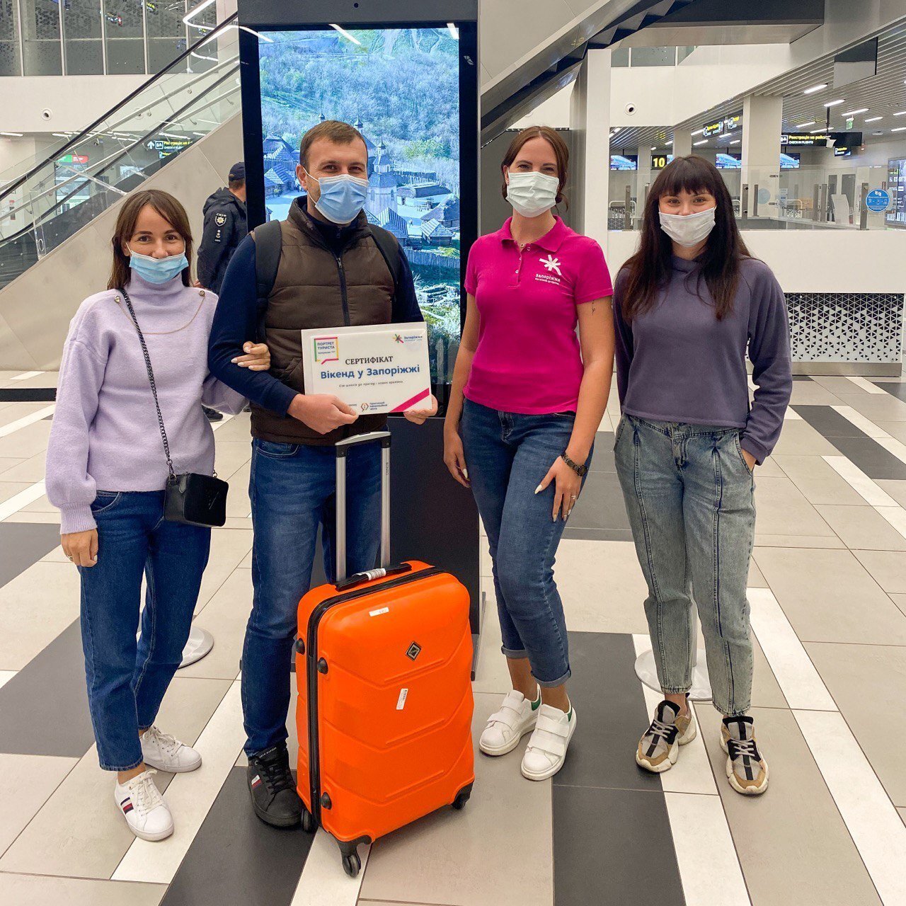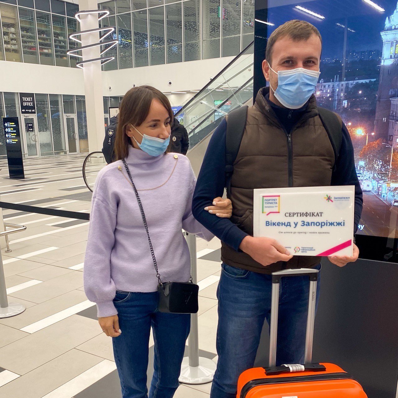 Нещодавно ми оголосили ім’я переможця нашого масштабного фотоконкурсу «Портрет туриста». Ним став Олександр з Києва. А вчора команда ТІЦ вже зустріла Олександра з дружиною Тетяною в аеропорту Запоріжжя та вручила сувеніри і подарунки. Вітаємо гостей у Запоріжжі!