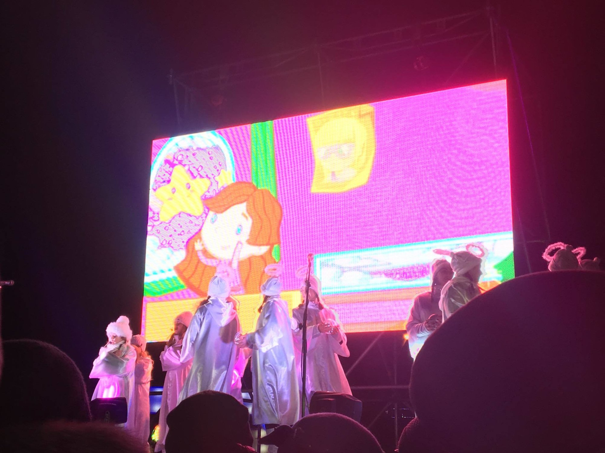 О 16.00 стартували святкові заходи на площі Маяковського. Захід проходив у вигляді інтерактивної програми, з хореографічними та вокальними постановами, казковими перевтіленнями, демонстраціями мультиплікаційних зимових сюжетів та гумору.