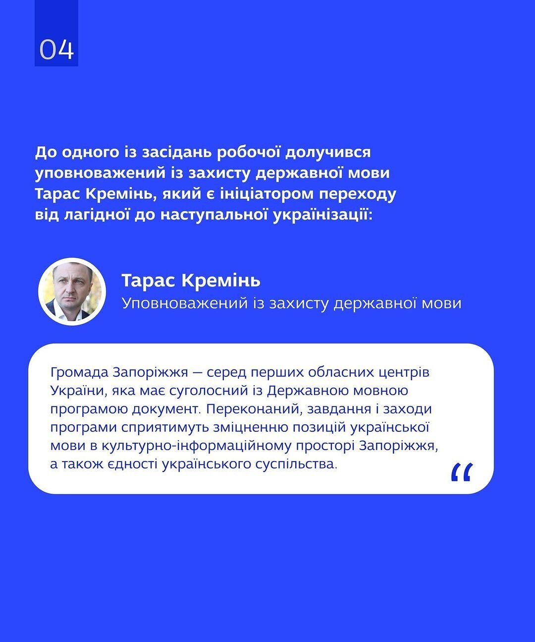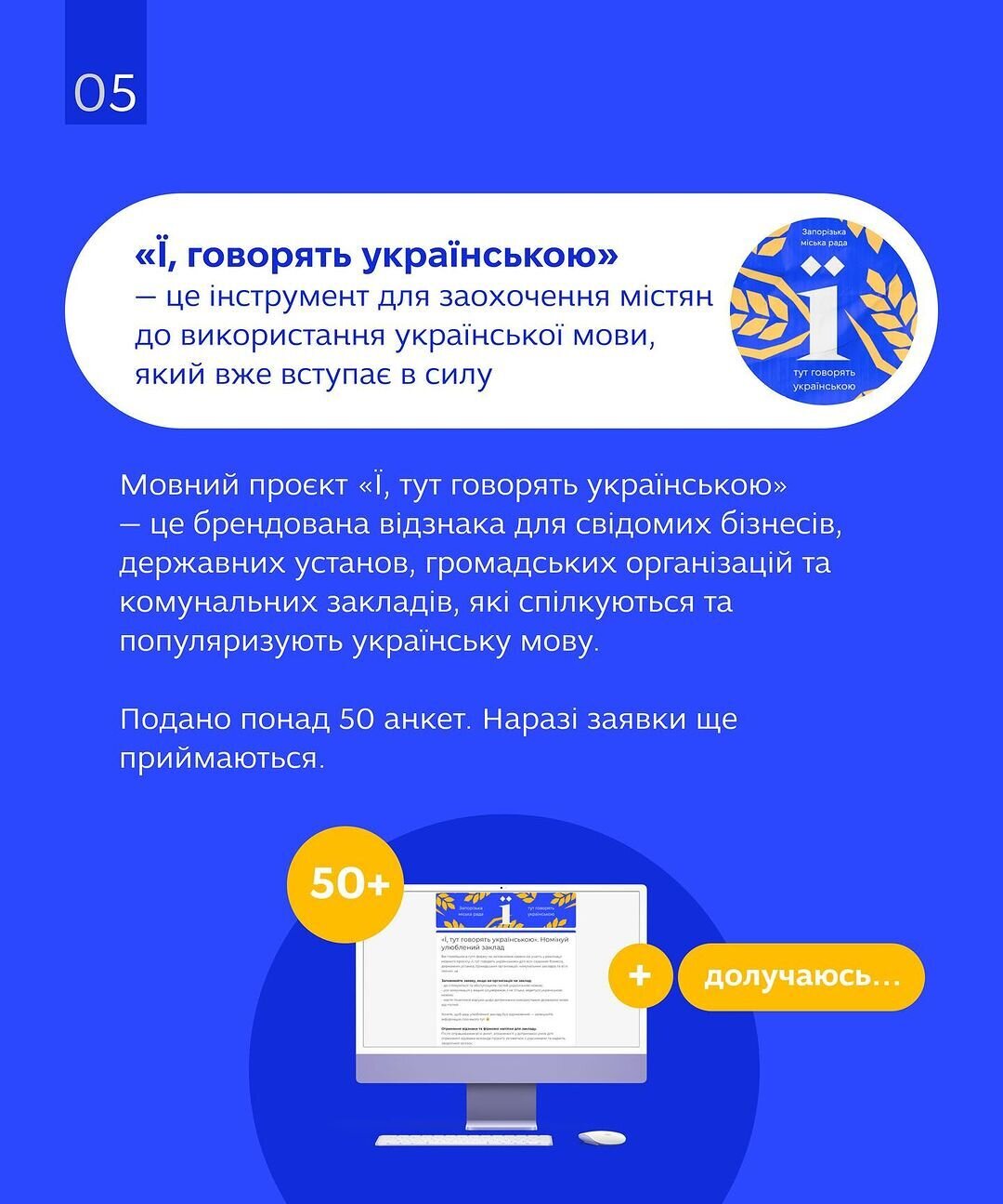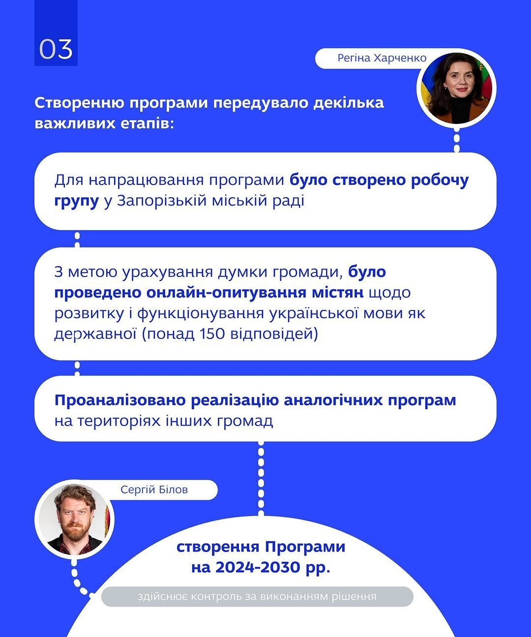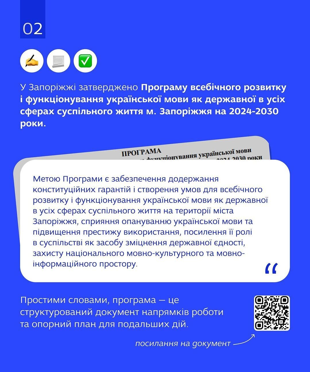 За ініціативи секретаря Запорізької міської ради — Регіни Харченко, була затверджена «Програма всебічного розвитку і функціонування української мови як державної в усіх сферах суспільного життя м. Запоріжжя на 2024-2030 роки». Це структурований документ напрямків роботи та опорний план для подальших дій з популяризації української мови в усіх сферах міста.